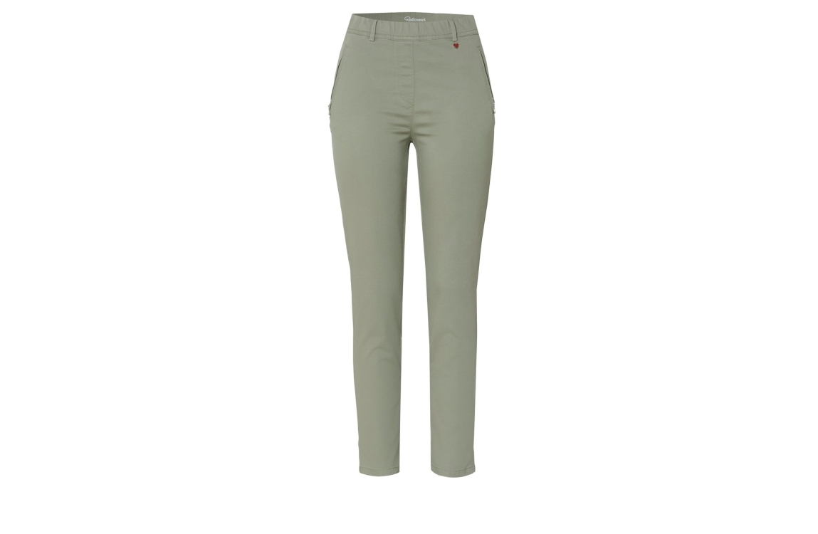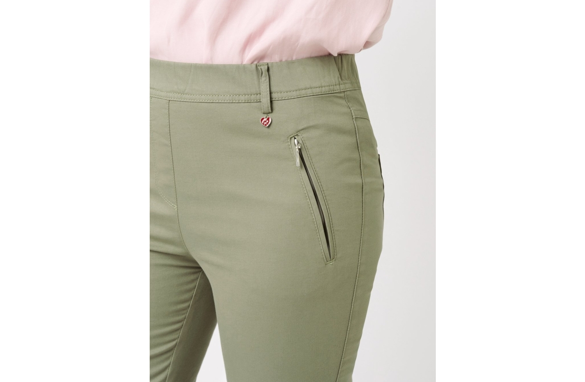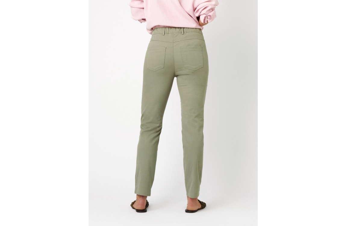 Relaxed by Toni broek Alice 22-08/2800-79. Dit 7/8 model sluit door middel van een elastische boord en is voorzien van ceintuurlussen. Deze groene broek van Relaxed by Toni is voorzien van twee schuine ritszakken aan de voorzijde en twee steekzakken aan de achterzijde.