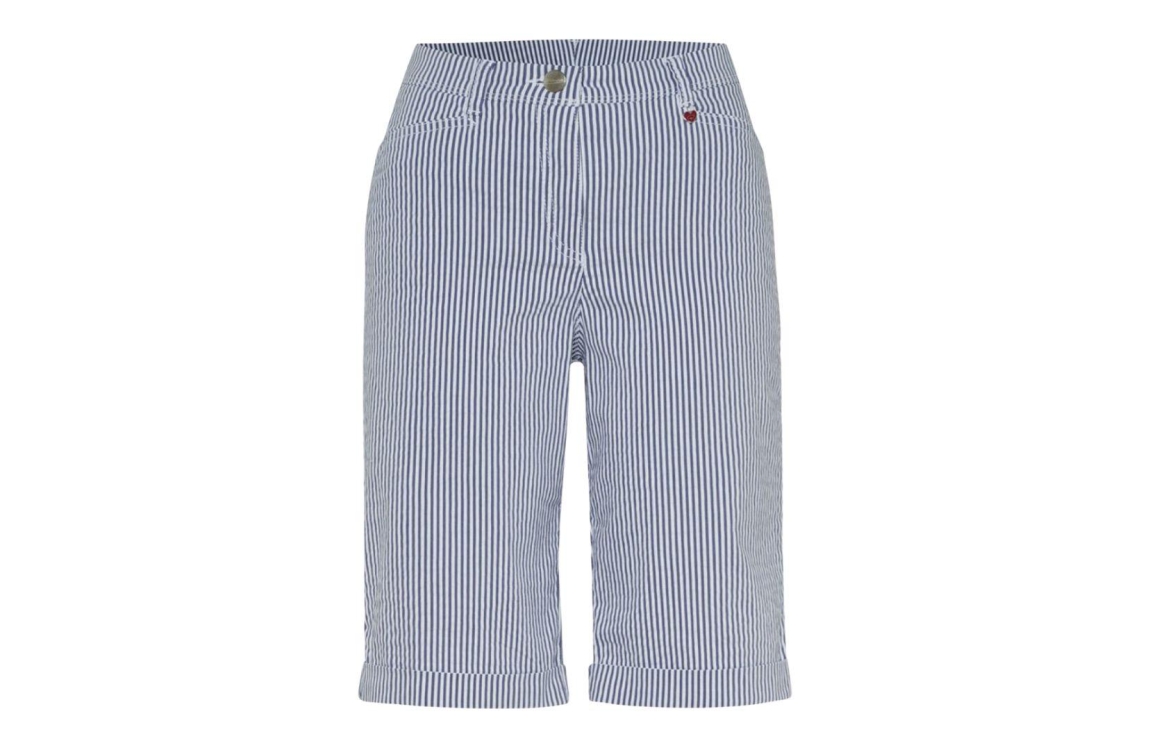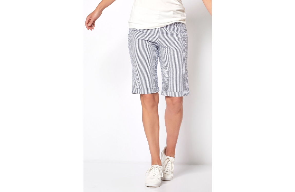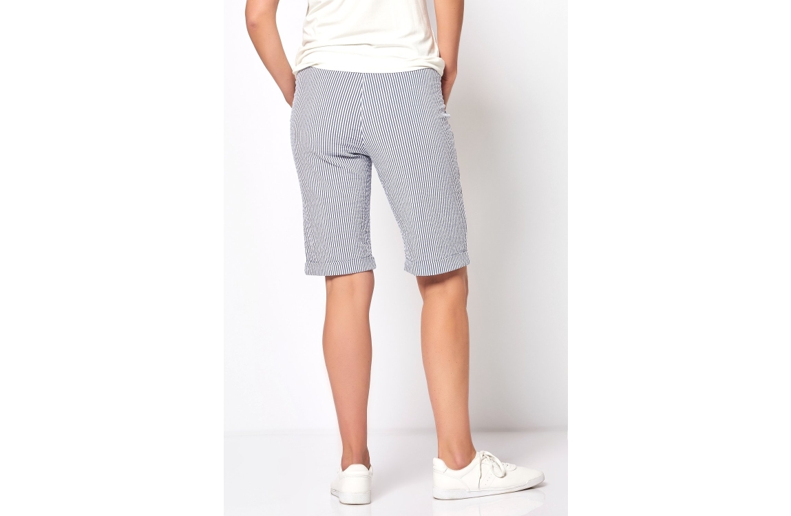 Relaxed by Toni broek 23-24. Dit bermuda model sluit door middel van een knoop- en ritssluiting en is voorzien van ceintuurlussen. Deze blauw- met wit gestreepte broek van Relaxed by Toni beschikt over twee steekzakken aan de voorzijde en is uitgevoerd in stretchkwaliteit.