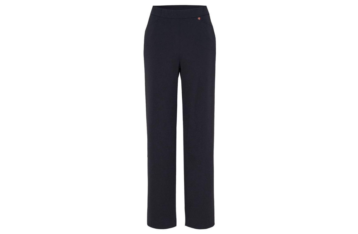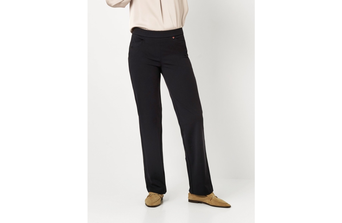 Relaxed by Toni broek Scarlet 61-16 2243-20. Dit wijdvallende model is voorzien van een elastische boord en lange pijpen. Deze donkerblauwe broek van Relaxed by Toni heeft twee steekzakken aan de voorzijde en is afgewerkt met een klein rood hartje op de zoom.