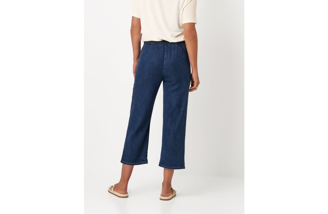 Relaxed by Toni broek 12-19/2243-24 057. Dit 6/8 model sluit door middel van een elastische boord. Deze donkere denim broek van Relaxed by Toni is voorzien van twee schuine steekzakken.