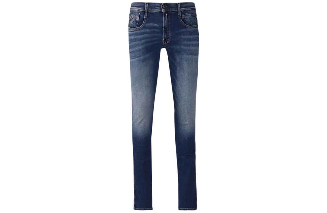 Replay jeans M914E-661604. Dit slim fit model sluit door middel van een knop en rits. Deze donker blauwe broek van Replay is een 5-pocket model en is afgewerkt met een merk embleem in de zak.