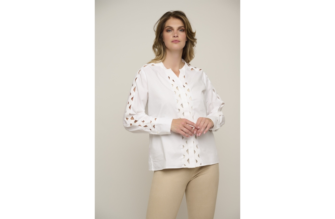 Rino & Pelle blouse Demi 7002422. Dit rechtvallend model is voorzien van een ronde hals en heeft lange mouwen. Deze witte blouse van Rino & Pelle sluit door middel van knopen en is bij de armen en aan de voorzijde bewerkt met opengewerkte details.