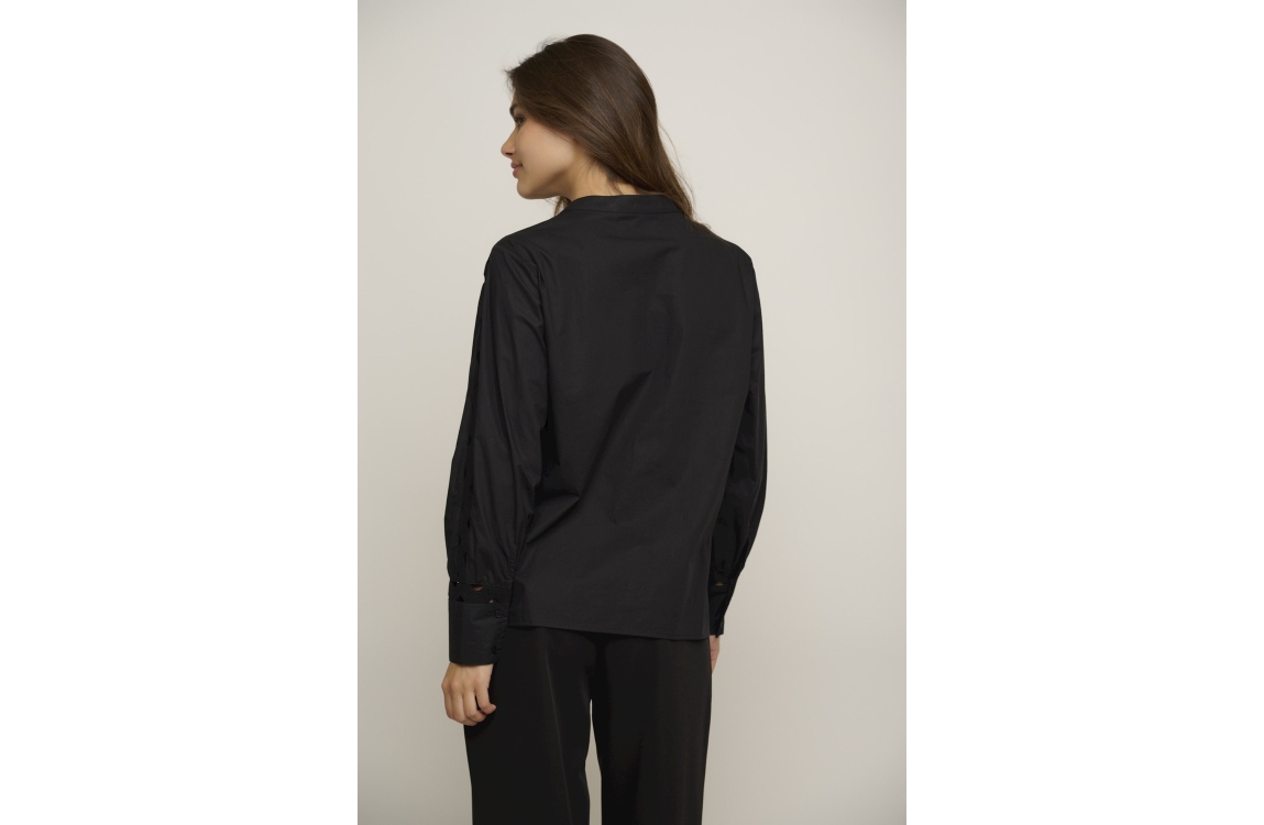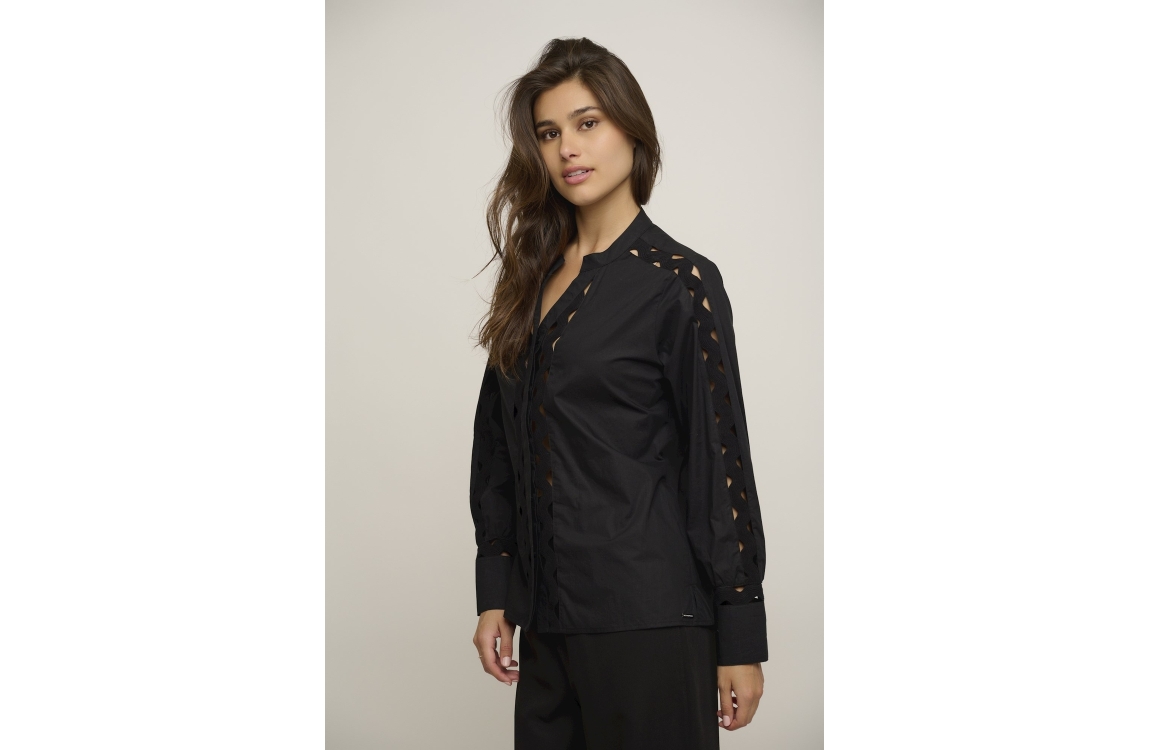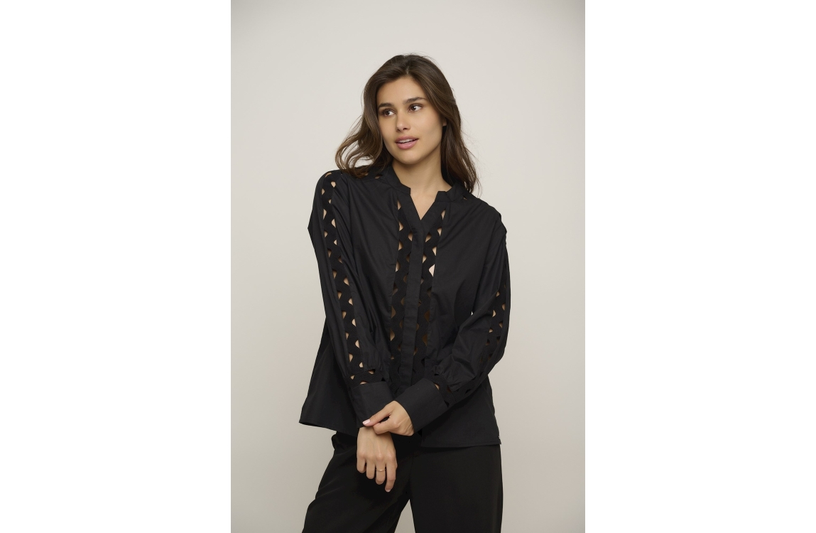 Rino & Pelle blouse Demi 7002422. Dit rechtvallend model is voorzien van een ronde hals en heeft lange mouwen. Deze zwarte blouse van Rino & Pelle sluit door middel van knopen en is bij de armen en aan de voorzijde bewerkt met opengewerkte details.