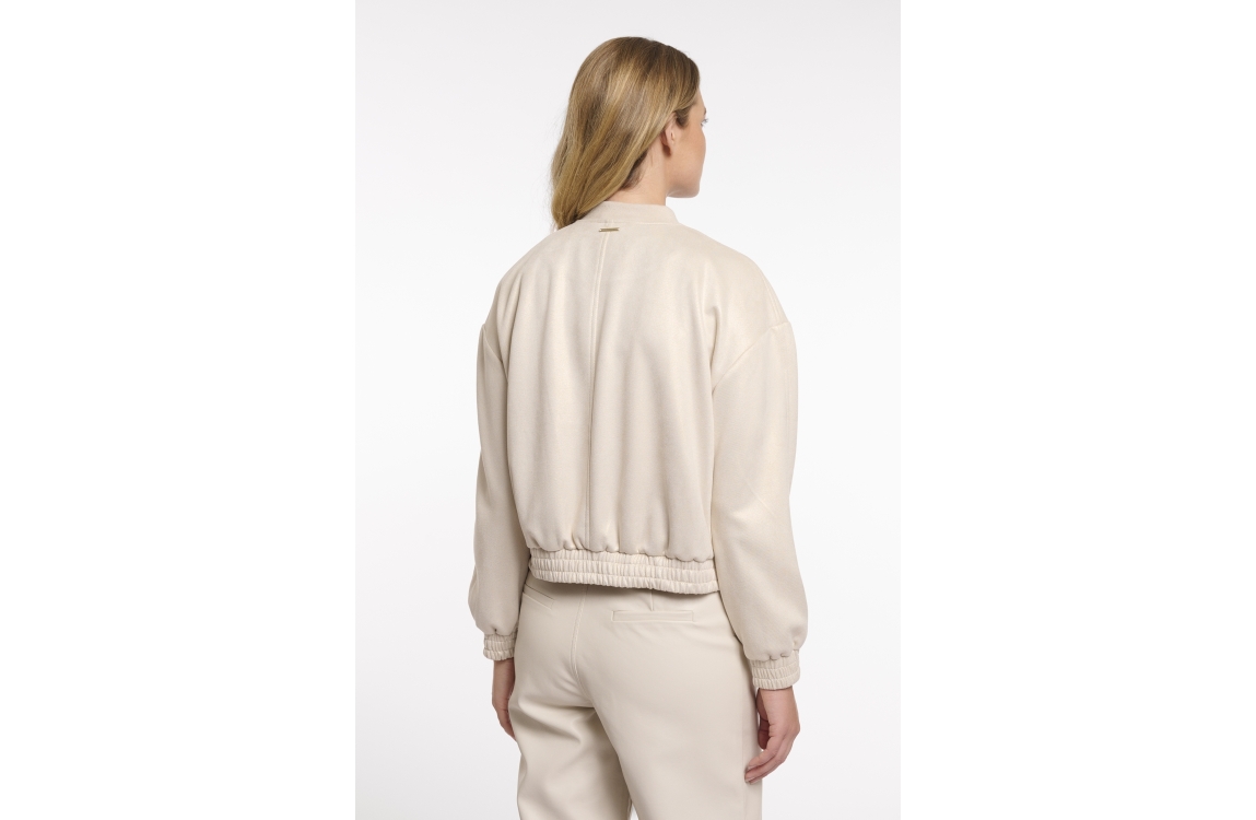 Rino en Pelle Bomber jacket with zipper closure 10828 birch gold. Dit bomber model is voorzien van een ronde hals en heeft lange mouwen. Deze beige bomber sluit door middel van een rits en heeft steekzakken met een drukknoop. Dit model is afgewerkt met boorden en all-over bewerkt met een subtiele glans.