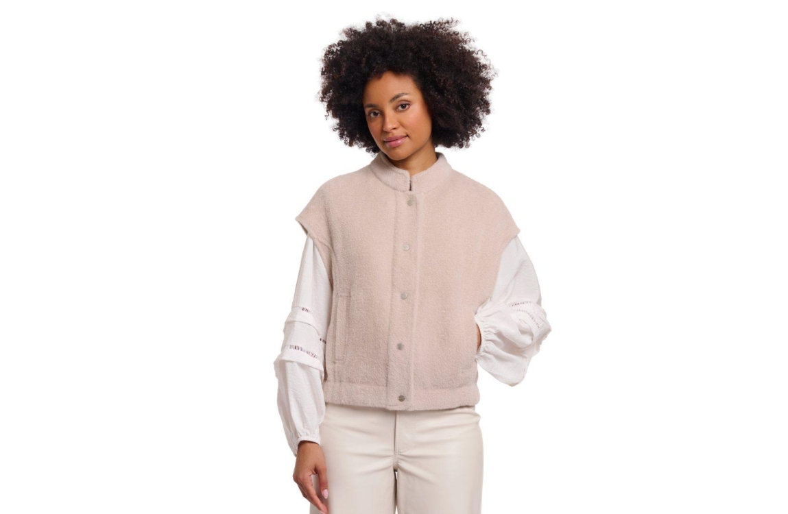 Rino en Pelle gilet Teuntje 7002621 11018. Dit rechtvallende model heeft een opstaande kraag en korte mouwen, met afhangende schouders. Het bruine jasje van Rino en Pelle sluit aan de voorzijde door middel van knopen en is voorzien van twee steekzakken.