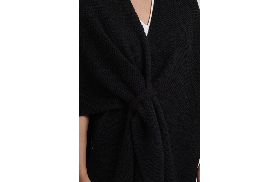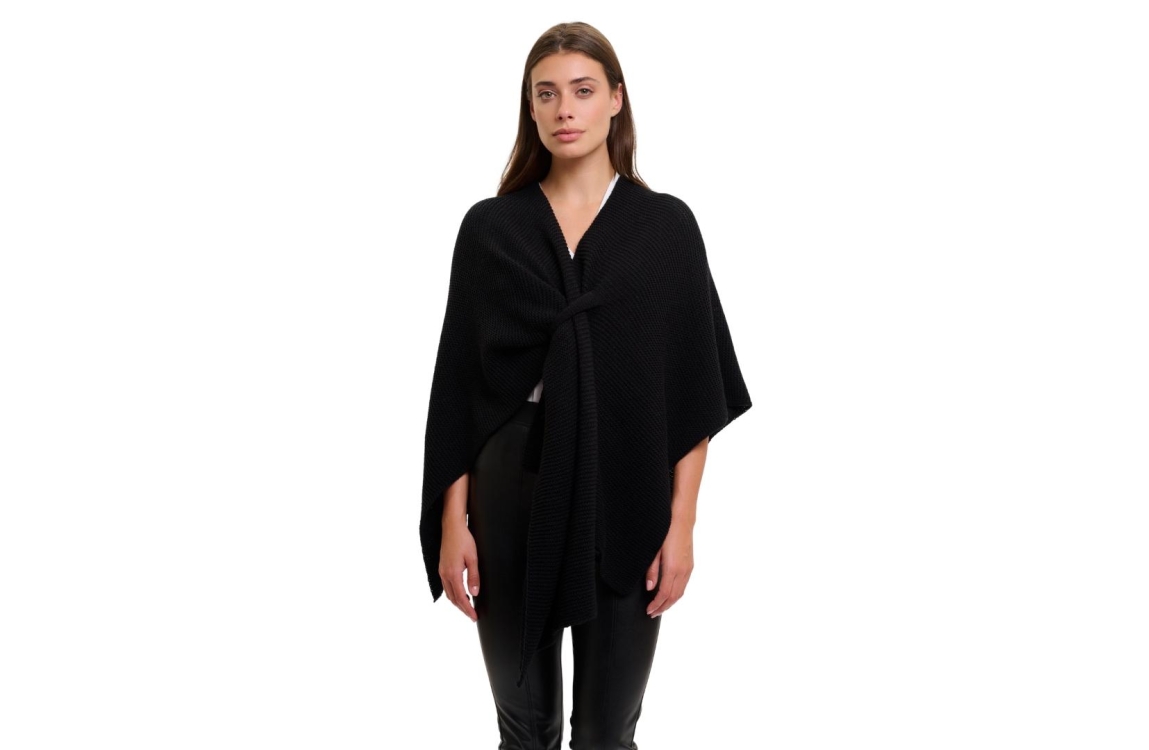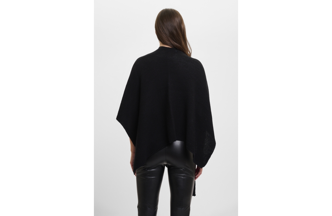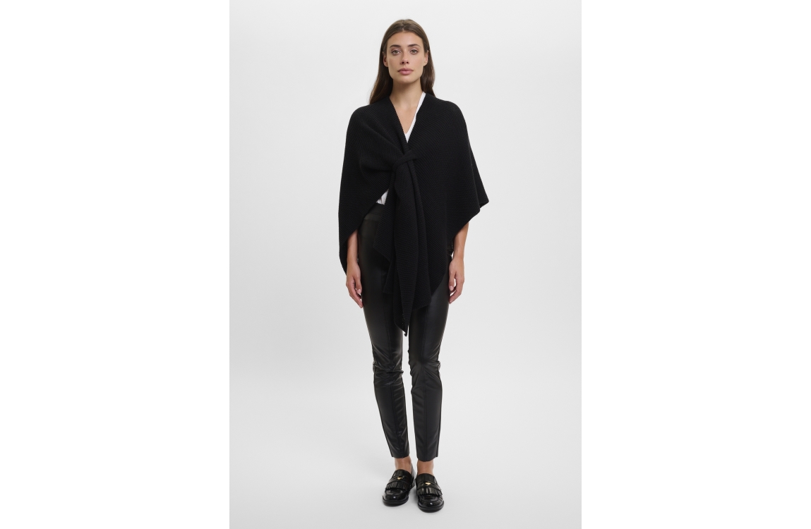 Rino & Pelle Cape Maviza.5002521. Dit soepelvallend zwarte cape van Rino & Pelle is voorzien van een ronde hals en heeft een lus om de cape te sluiten.