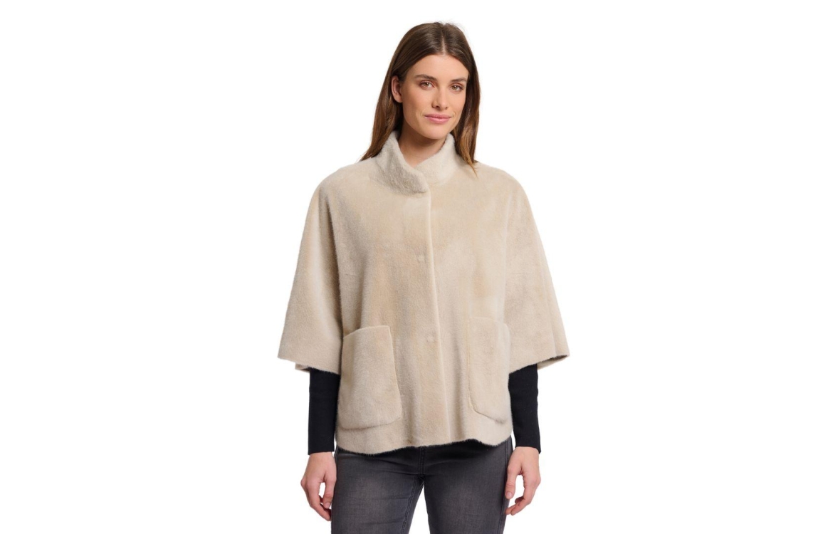 Rino & Pelle cape Dewi. Dit wijdvallend model is voorzien van een opstaande ronde kraag en heeft driekwart mouwen. Deze beige faux fur cape van Rino & Pelle sluit door middel van knopen, ook bij de mouwen en beschikt over twee opgestikte zakken.
