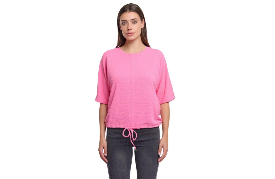 Rino & Pelle top Najila 7002521. Dit wijdvallend model heeft een ronde halslijn en middellange mouwen. Deze roze top van Rino & Pelle is all-over bewerkt met een ribstructuur en beschikt over een verstelbare trekkoord in de zoom.