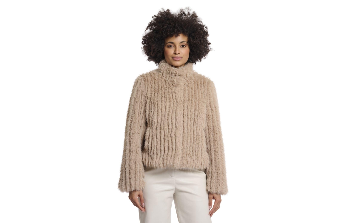 Rino en Pelle Jacket with closure 10866 oat. Dit rechtvallende model heeft een opstaande kraag en lange mouwen. Deze licht bruine jas van Rino en Pelle sluit aan de voorzijde door middel van drukknopen en is uitgevoerd in fluffy stof. Het model beschikt over twee steekzakken en is gevoerd.