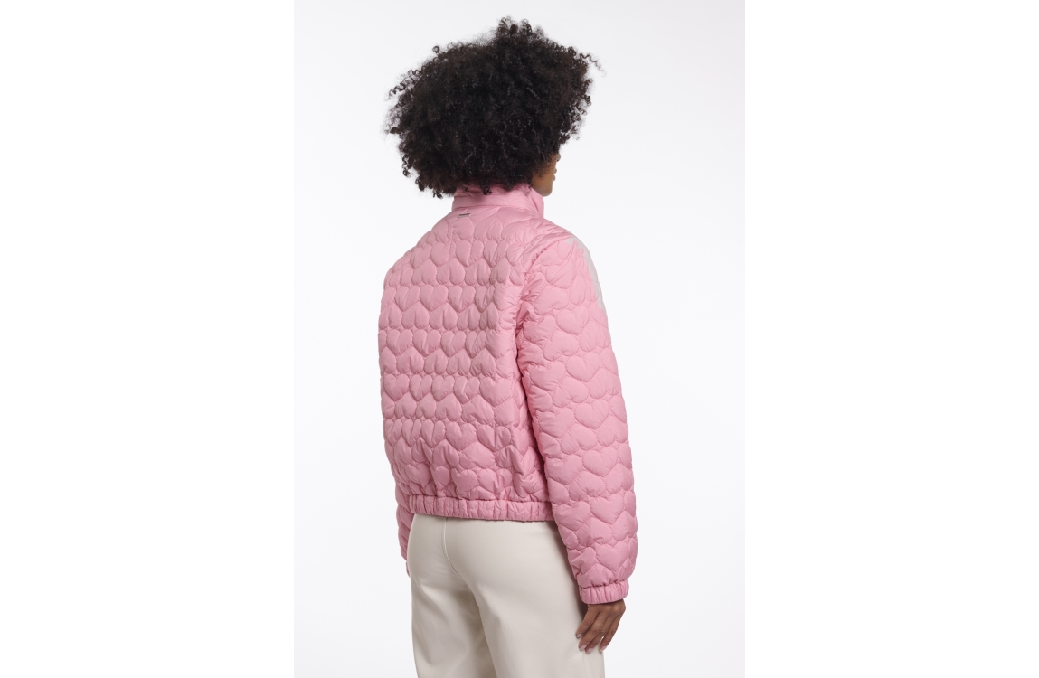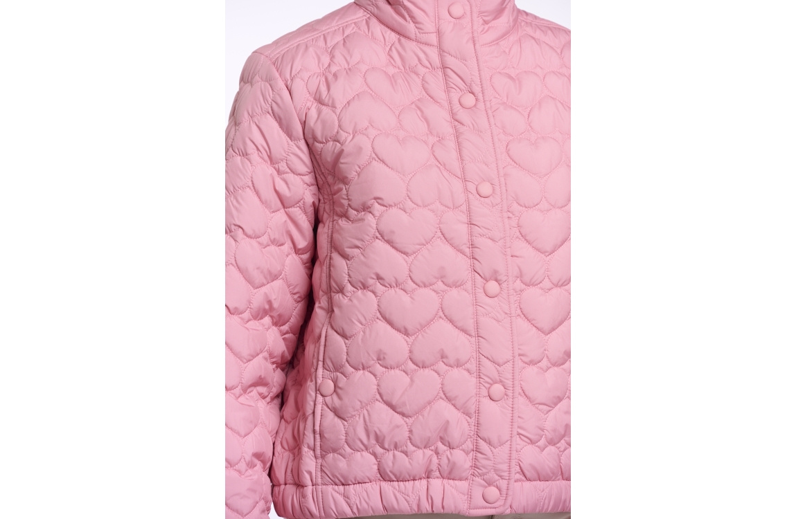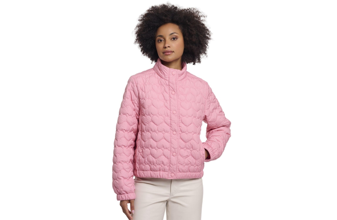 Rino en Pelle Light padded cropped jacket 11016 cotton candy. Dit rechtvallende model is voorzien van een opstaande hals en lange mouwen. Deze roze jas van Rino & Pelle is aan de voorzijde voorzien van twee steekzakken met drukknoop en sluit aan de voorzijde door middel van drukknopen. Dit model is licht gewatteerd en is all-over bewerkt met stiksels in een hartjes patroon.