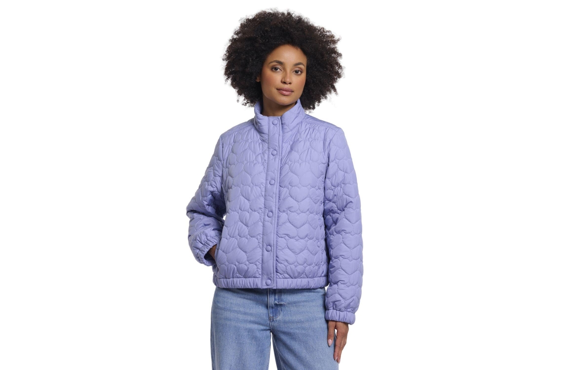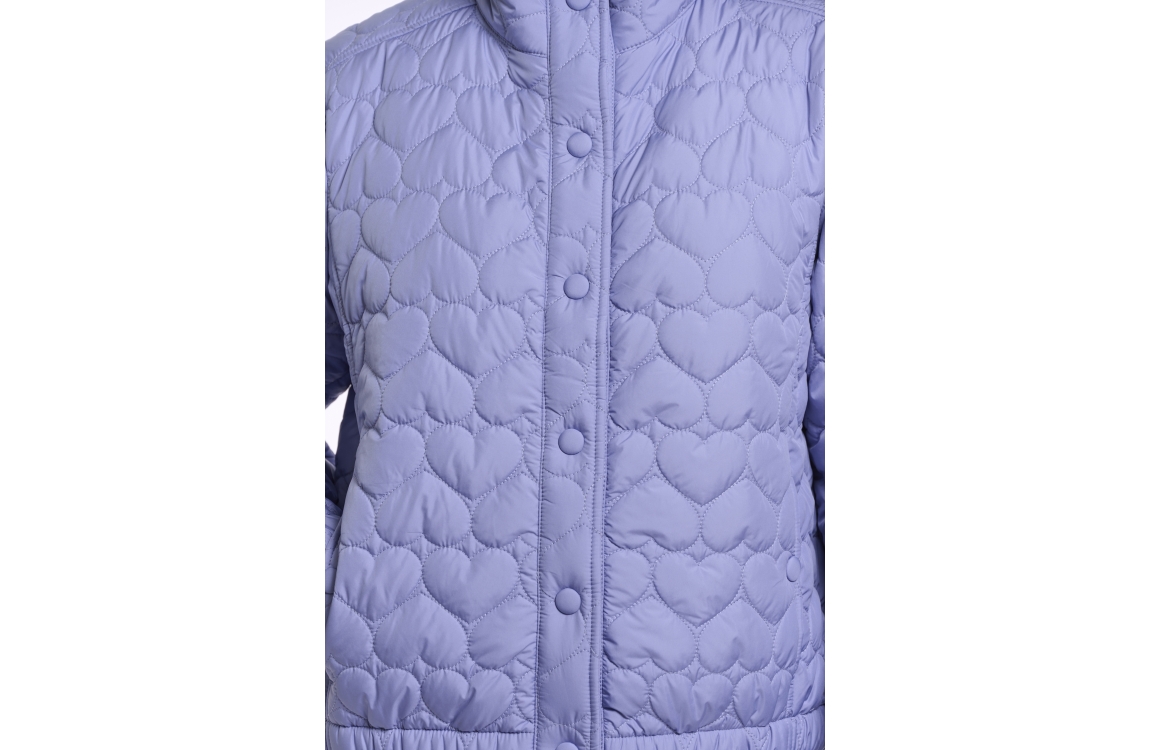 Rino en Pelle Light padded cropped jacket 11021 brushed blue. Dit rechtvallende model is voorzien van een opstaande hals en lange mouwen. Deze blauwe jas van Rino & Pelle is aan de voorzijde voorzien van twee steekzakken met drukknoop en sluit aan de voorzijde door middel van drukknopen. Dit model is licht gewatteerd en is all-over bewerkt met stiksels in een hartjes patroon.