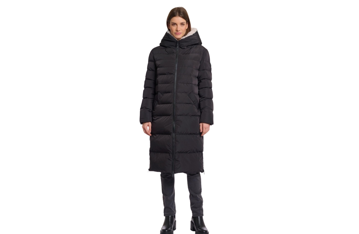 Rino en Pelle jas Keilafur 7002511 10793. Dit rechtvallende model heeft een capuchon en lange mouwen. Deze zwarte jas van Rino en Pelle sluit aan de voorzijde door middel van een ritssluiting en is voorzien van twee knoopzakken. Het model is gedetailleerd met faux fur stof aan de binnenkant en is afgewerkt met ritsen in de zoom.