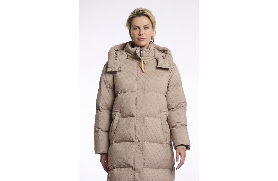 Rino en Pelle Long structure padded coat 10868 toffee. Dit regular fit model heeft een capuchon en lange mouwen. Deze bruine jas van Rino en Pelle sluit aan de voorzijde door middel van een rits en beschikt over twee schuine zakken met knoopsluiting. Dit model is all-over bewerkt met een patroon.