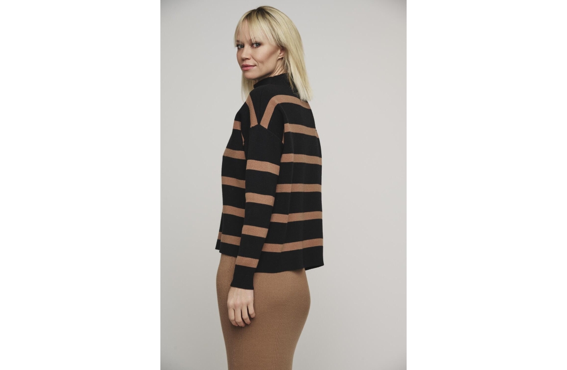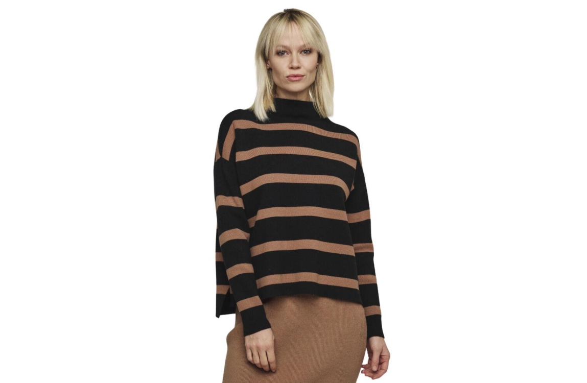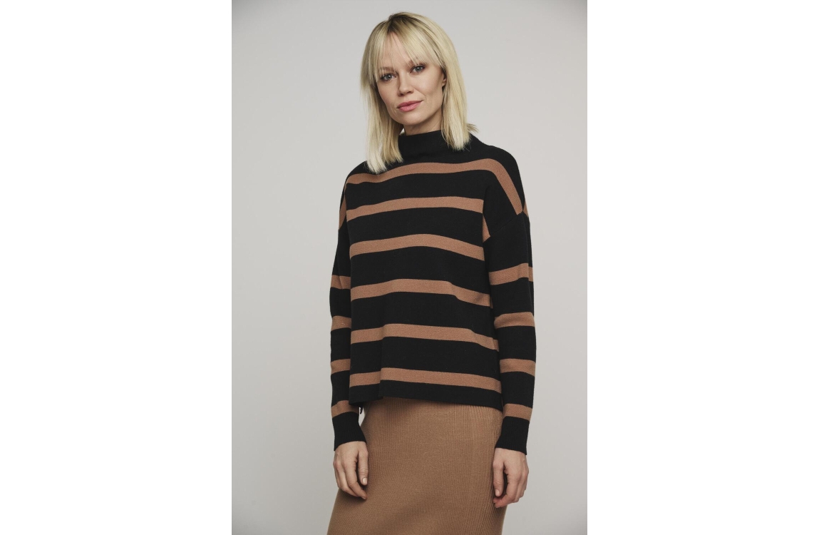 Rino & Pelle sweater Moxie 5002413. Dit rechtvallend model is voorzien van een turtle neck en heeft lange mouwen. Deze zwarte sweater van Rino & Pelle is bewerkt met bruine strepen.