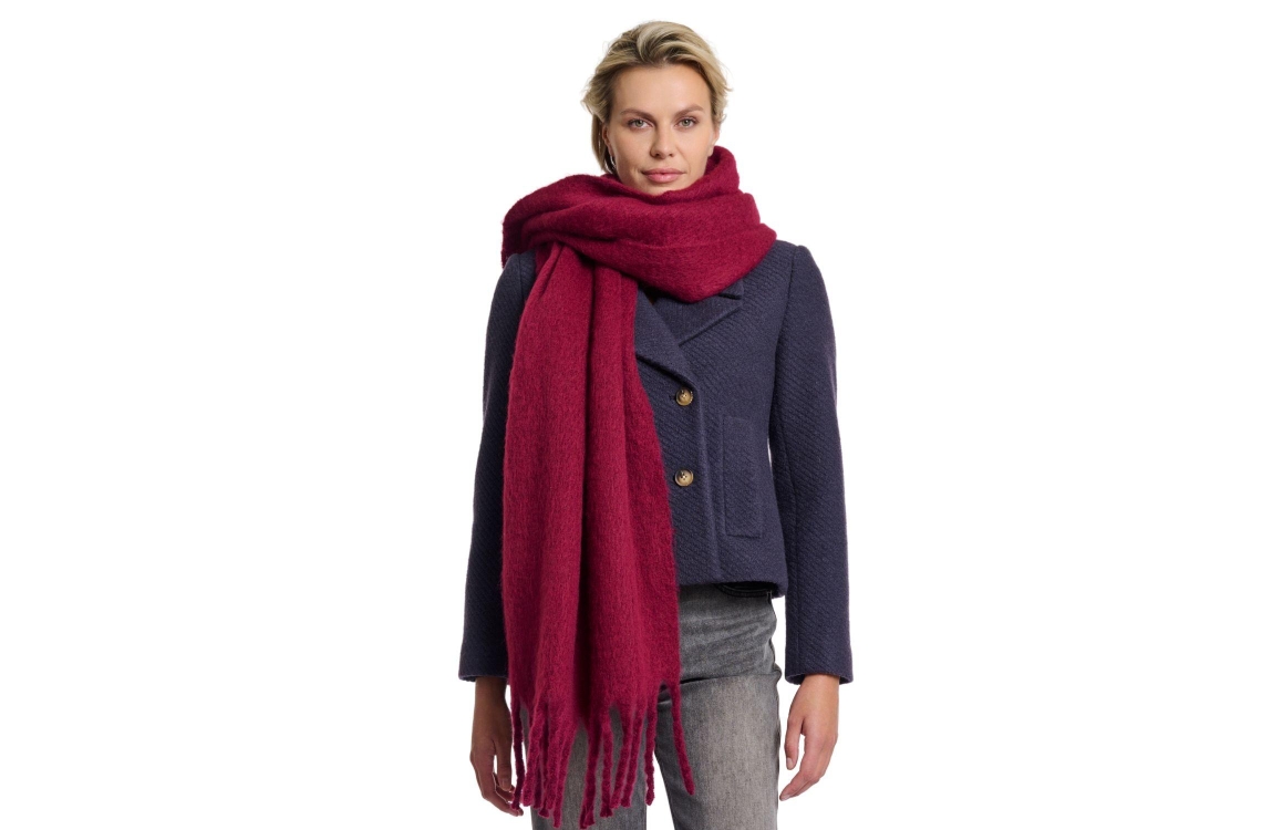 Rino en Pelle sjaal Gella 7002512 10881. Dit paarse, rechthoekige model is uitgevoerd in een fijn breisel en afgewerkt met franjes aan de uiteinden.