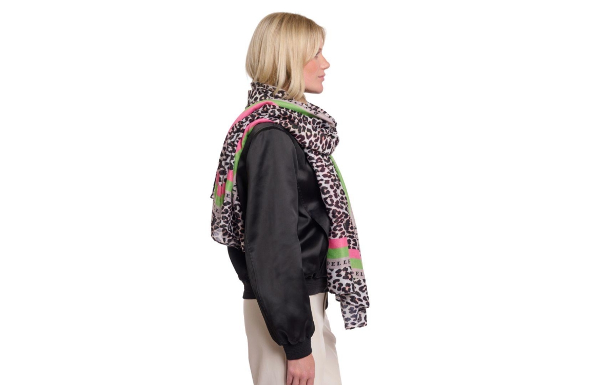 Rino en Pelle sjaal Klaartje 7002621 8980. Dit rechthoekig model is all-over bewerkt met een leopardprint in verschillende kleuren. Deze sjaal van Rino en Pelle is gedetailleerd met het merkembleem en streepprint.