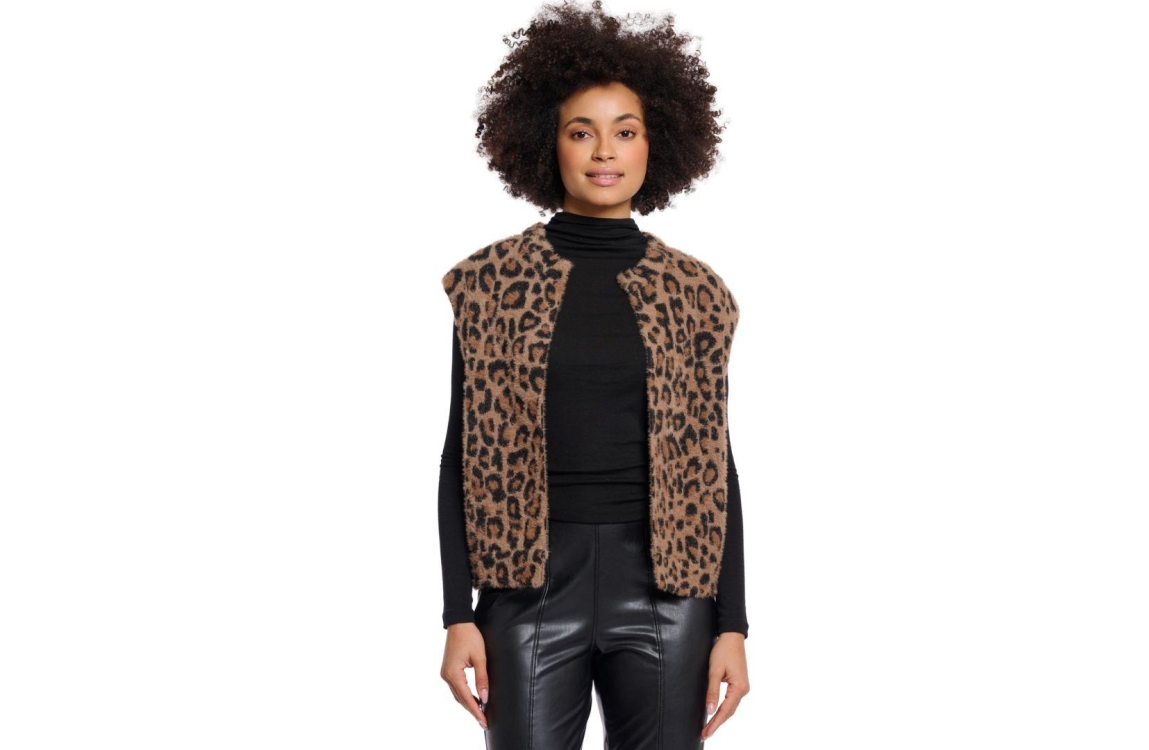 Rino en Pelle gilet Elona 5012511. Dit rechtvallende model heeft een ronde hals en is mouwloos. Deze bruine gilet van Rino en Pelle is all-over bewerkt met panterprint en heeft afgewerkte boorden.