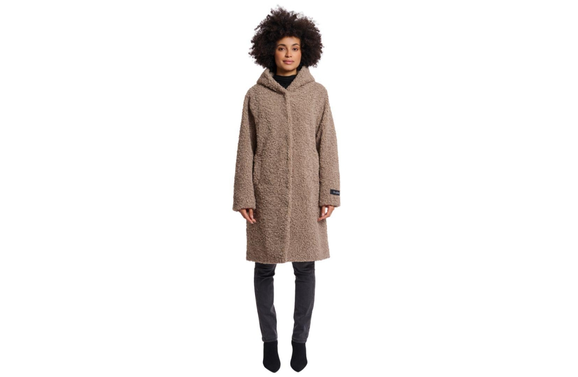 Rino en Pelle jas Leonie.7002512. Dit rechtvallende model een opstaande kraag en capuchon. Deze bruine jas van Rino en Pelle sluit aan de voorzijde door middel van knopen en is uitgevoerd in teddy-stof. Dit model is voorzien van twee steekzakken en is gedetailleerd met een label 'real faux' op de linkermouw.