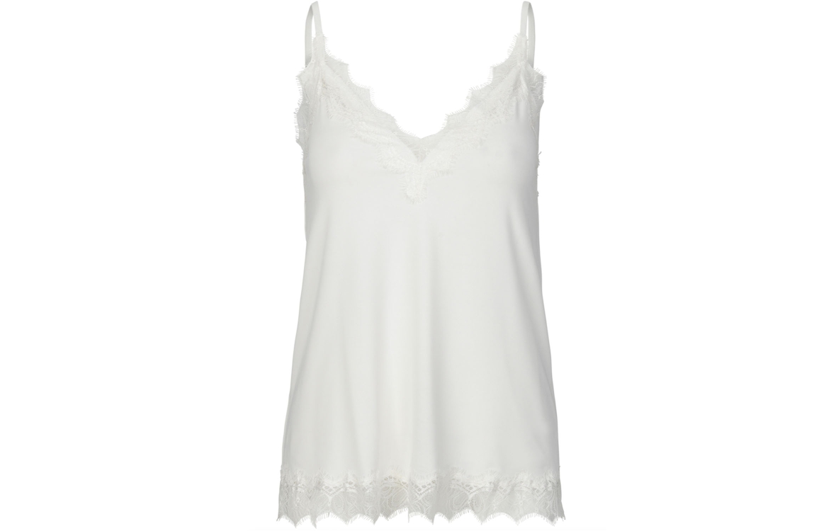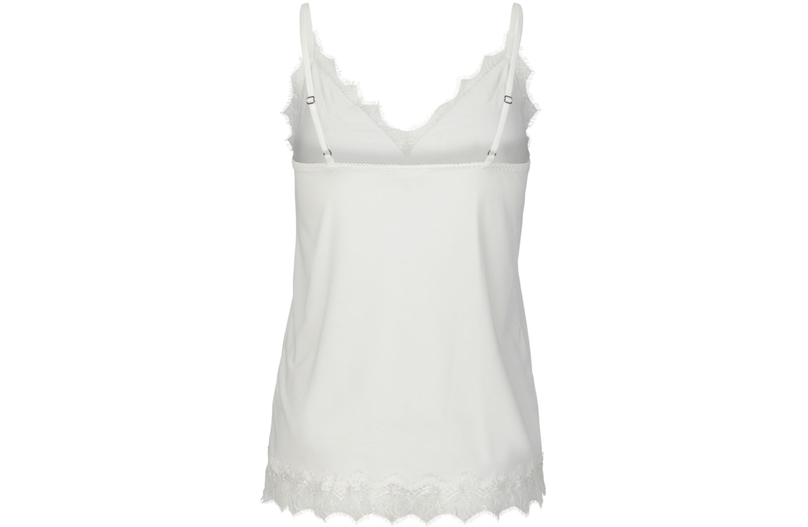 Rosemunde top 4217-037. Dit recht vallende model is voorzien van een v-hals en is mouwloos. Deze witte top van Rosemunde bevat veel stretch en is afgewerkt met kant.