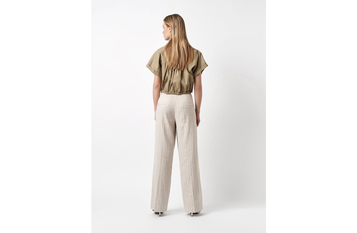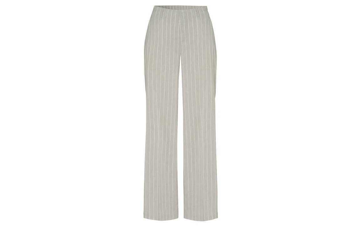 Rosner broek Mara. Dit wide leg model sluit door middel van een elastische boord en beschikt over twee steek- en paspelzakken. Deze zandkleurige broek van Rosner is bewerkt met strepen.
