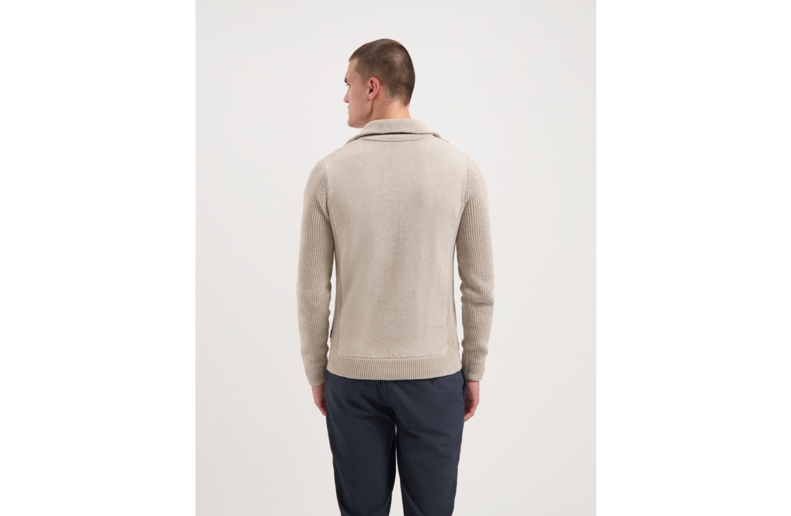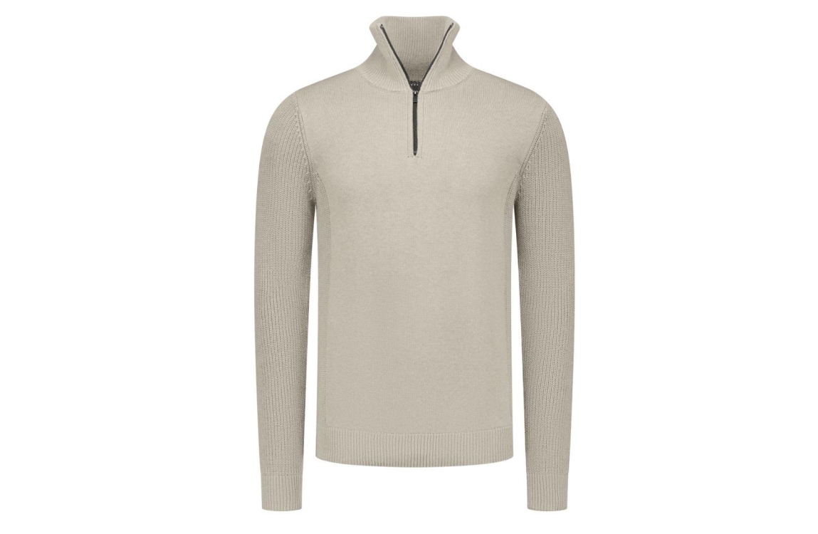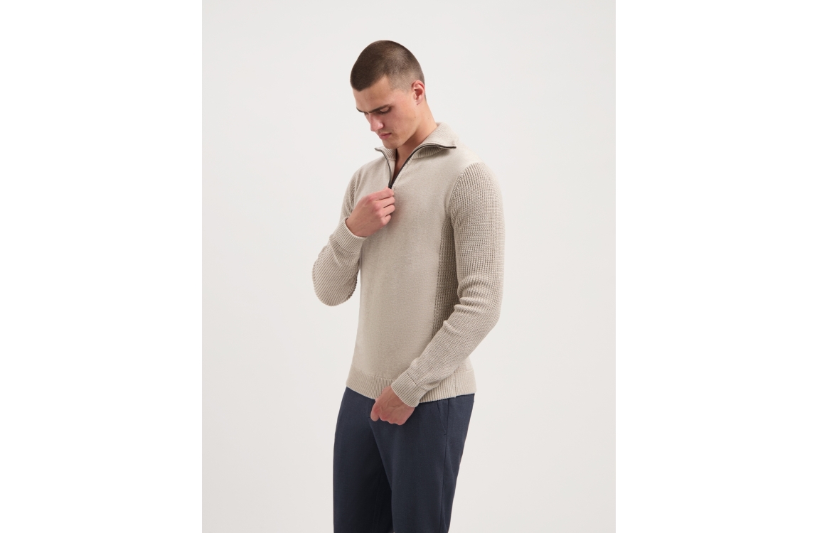 Saint Steve BENJAMIN-S 20006 sand melange. Dit rechtvallende model is voorzien van een opstaande kraag en heeft lange mouwen. Deze beige trui van Saint Steve sluit aan de bovenzijde door middel van een rits.