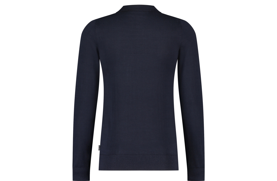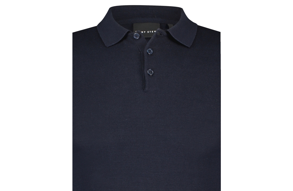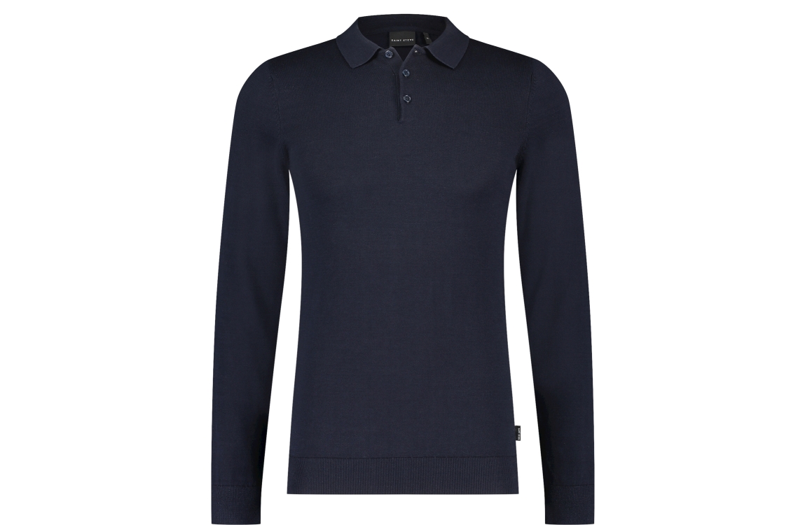 Saint Steve poloshirt Berend 19478-70003. Dit rechtvallend model heeft een kraag en lange mouwen. Deze donkerblauwe poloshirt van Saint Steve sluit aan de voorzijde bij de hals door middel van knopen en is afgewerkt met ribgebreide boorden.