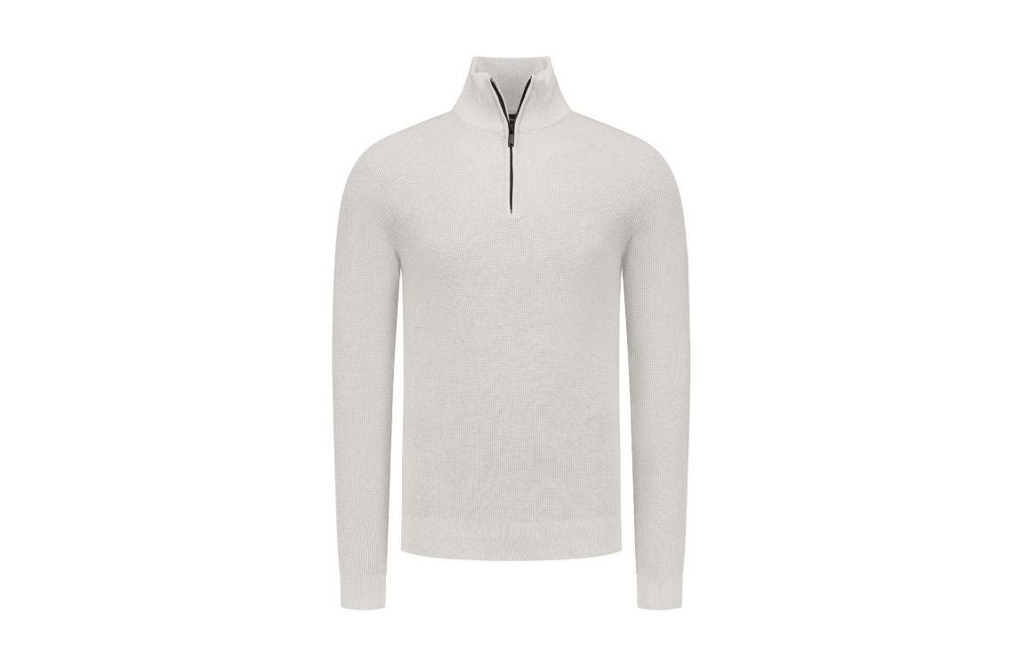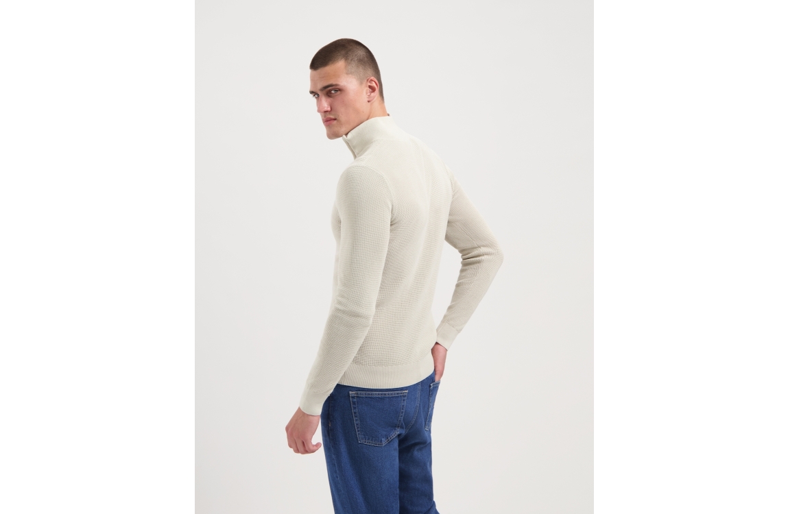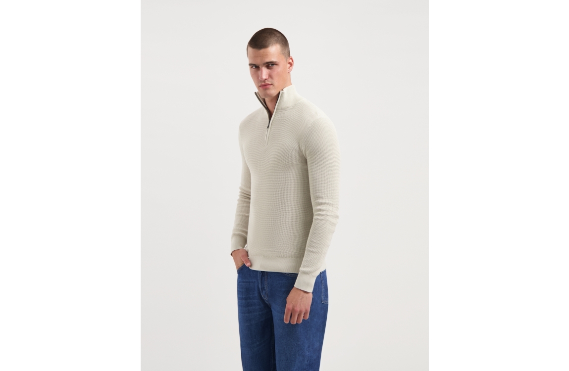 Saint Steve DOMINIC-S 90006 stone. Dit rechtvallende model heeft een opstaande kraag die sluit door een rits en heeft lange mouwen. Deze licht grijze pullover van Saint Steve is afgewerkt met ribboorden.