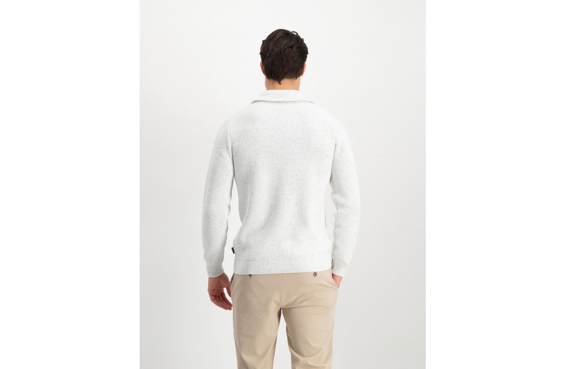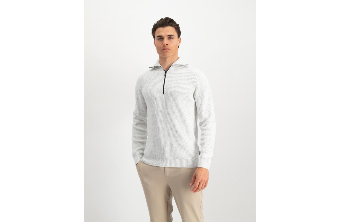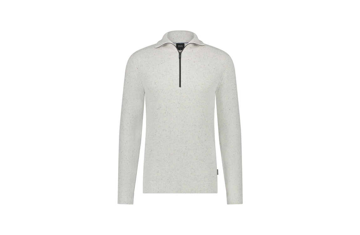 Saint Steve trui Ken 230573. Dit rechtvallend model is voorzien van een opstaande kraag en heeft lange mouwen. Deze witte gerbeide trui van Saint Steve sluit aan de bovenzijde door middel van een rits en is bewerkt met blauwe puntjes stof all-over.
