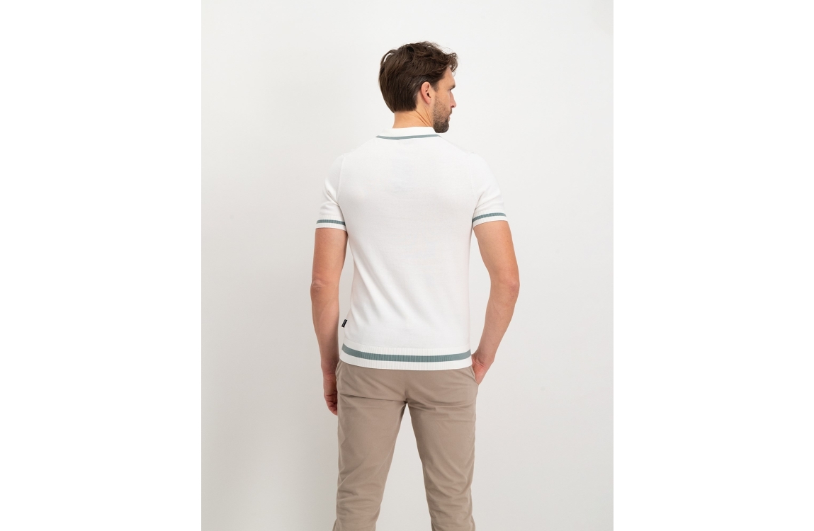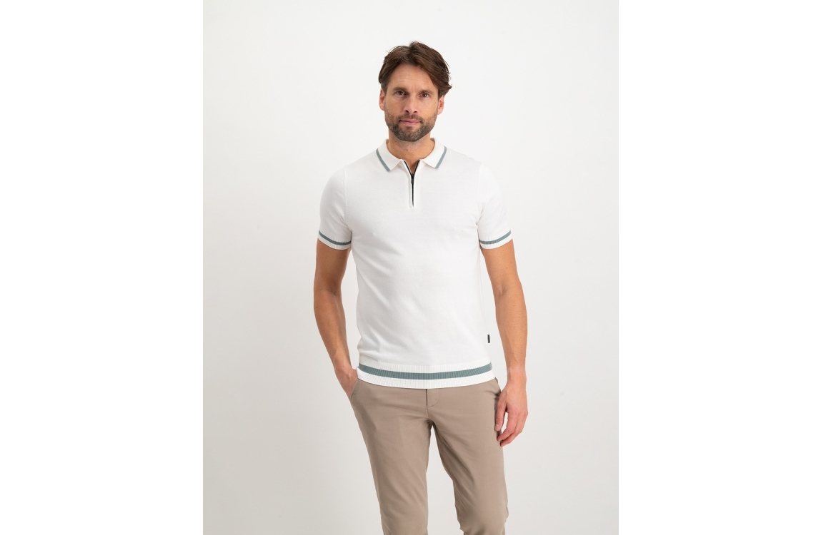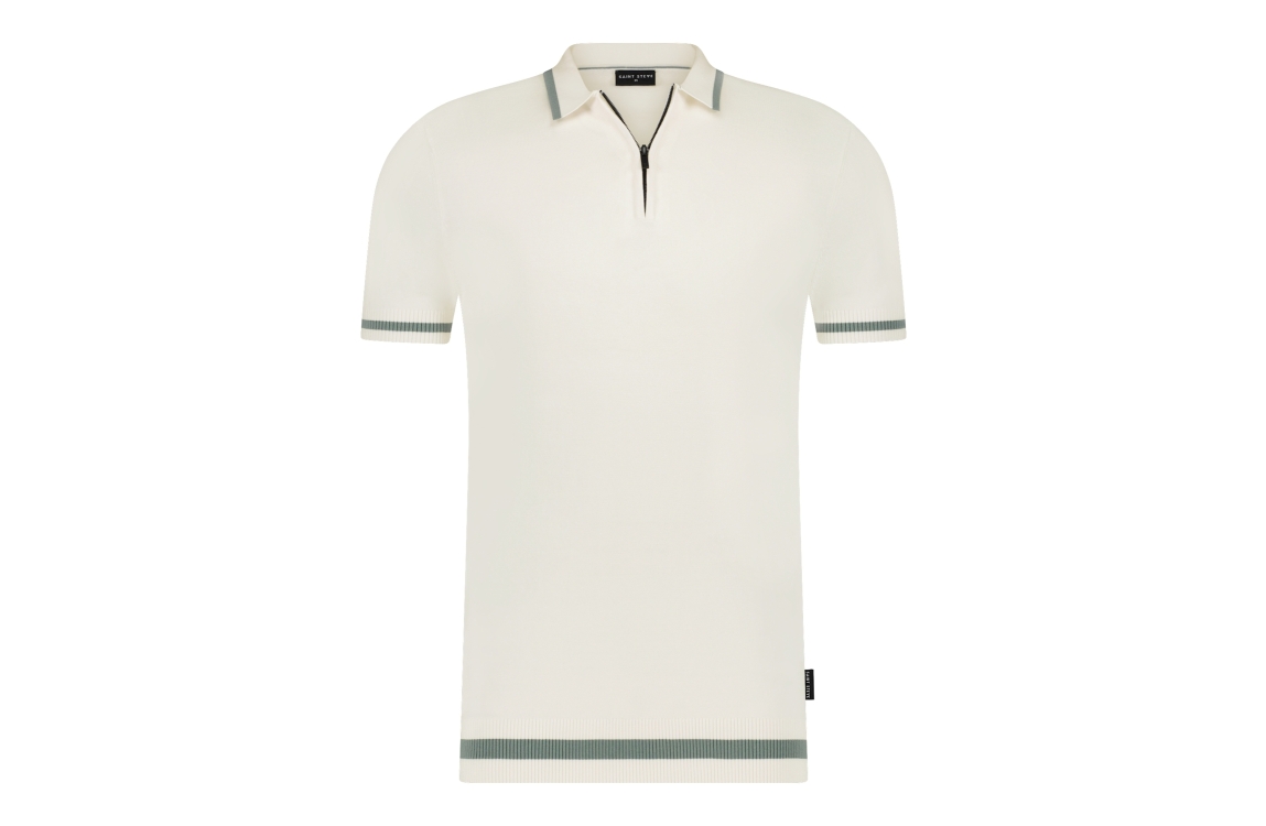 Saint Steve poloshirt Siem 221148. Dit aangesloten model is voorzien van een openstaande kraag. Deze witte polo sluit aan de bovenzijde doormiddel van een rits. Dit model is afgewerkt met aangesloten boorden en bewerkt met groene bies .