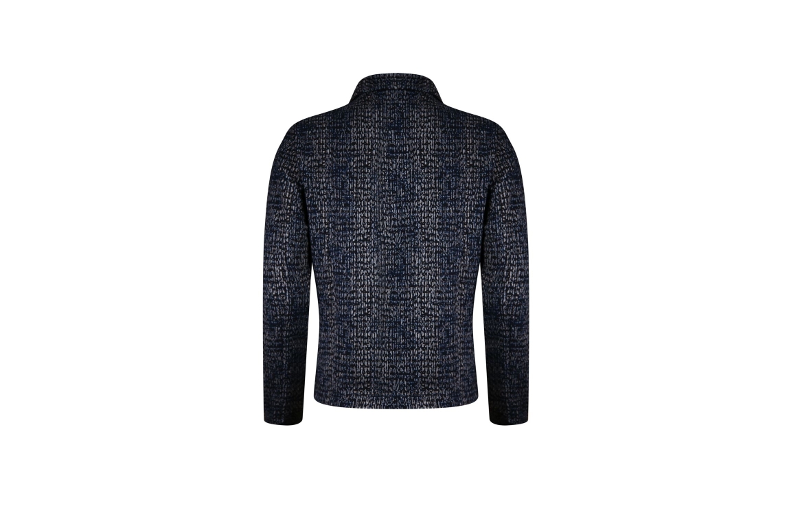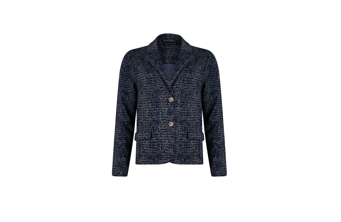Roberto Sarto blazer 531138. Dit licht getailleerde model heeft een reverskraag en lange mouwen. Deze donkerblauwe blazer van Roberto Sarto sluit aan de voorzijde door middel van knopen en is all-over bewerkt met een grafische print in verschillende tinten. Het model is voorzien van twee klepzakken en schoudervulling.