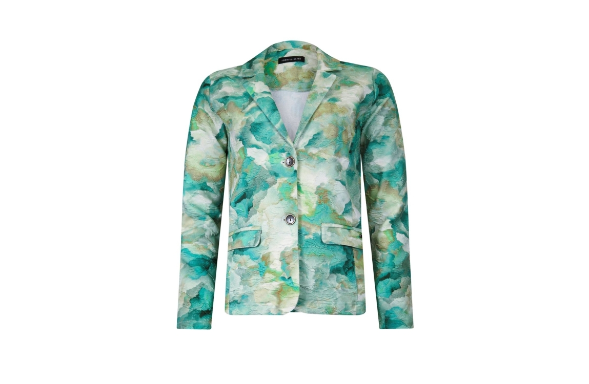 Roberto Sarto jasje 611166. Dit rechtvallende model is voorzien van een kraag en heeft lange mouwen. Dit groene jasje van Roberto Sarto sluit aan de voorzijde door middel van knopen en heeft twee decoratieve klepzakken. Dit model is bewerkt met een print.