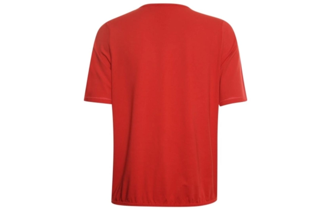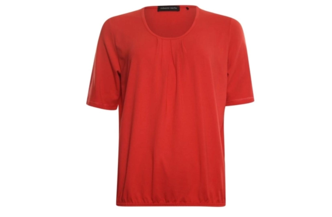 Roberto Sarto top 411113. Dit rechtvallend model heeft een ronde hals en korte mouwen. Deze rode top van Roberto Sarto is voorzien van een elastische boord aan de onderzijde en is uitgevoerd met plooien bij de hals.