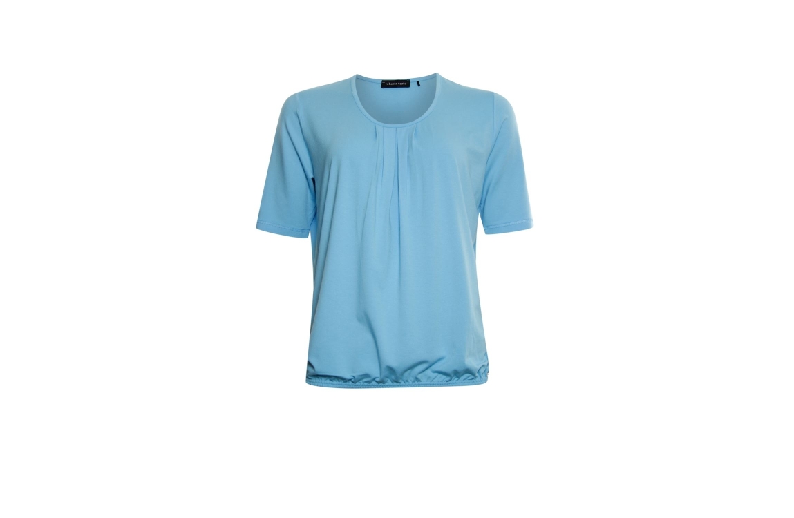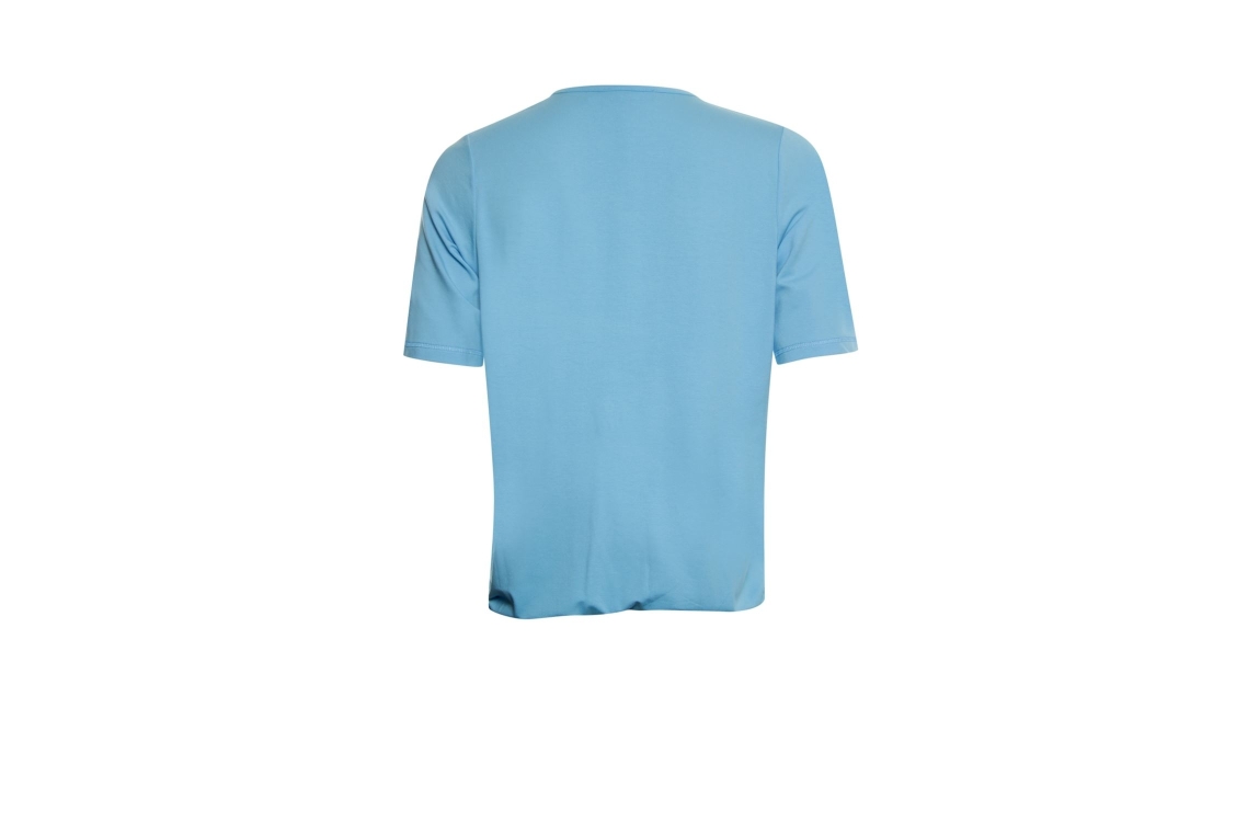 Roberto Sarto 411113. Dit rechtvallend model heeft korte mouwen en een ronde hals. Deze blauwe top van Roberto Sarto is aan hals gedetailleerd met halsrimpels en heeft een elastische boord aan de onderzijde.