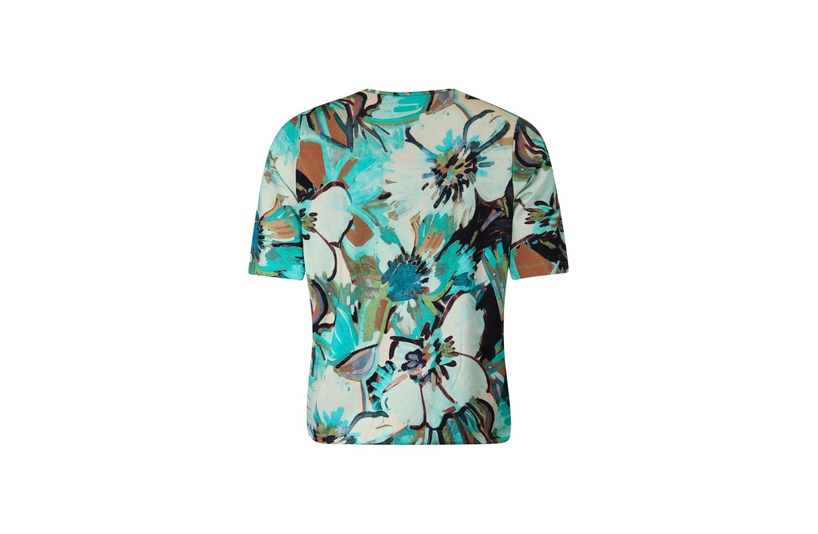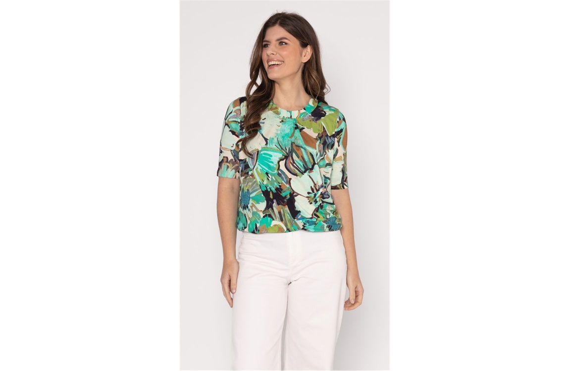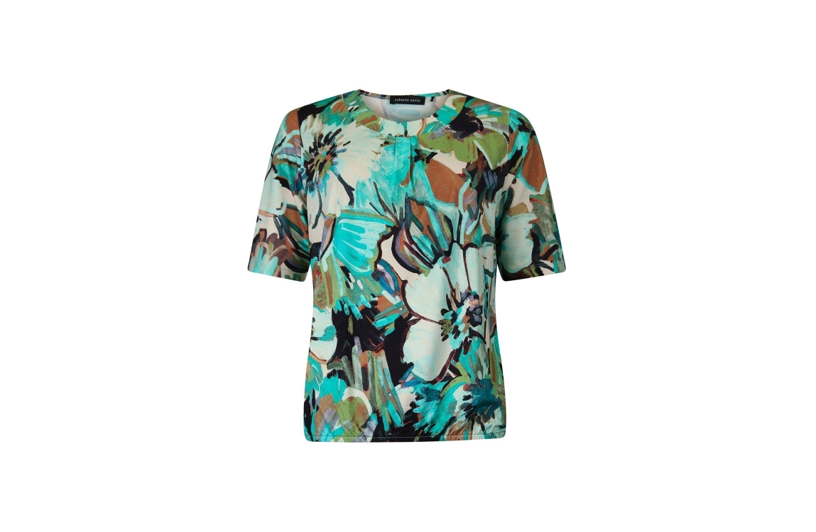 Roberto Sarto blouson 611128. Dit soepelvallende model is voorzien van een ronde hals en heeft driekwart mouwen. Deze groene blouson van Roberto Sarto is aan de onderzijde voorzien van een elastische boord. Dit model is bewerkt met een motief.