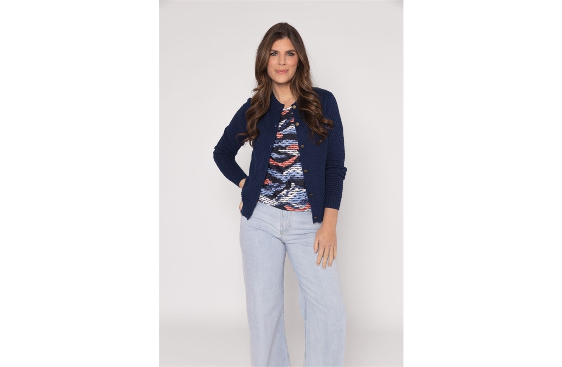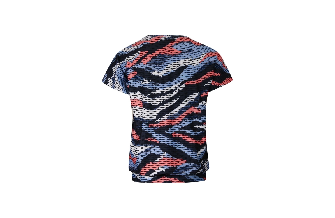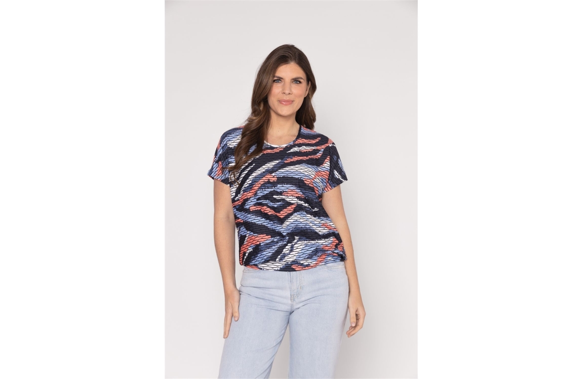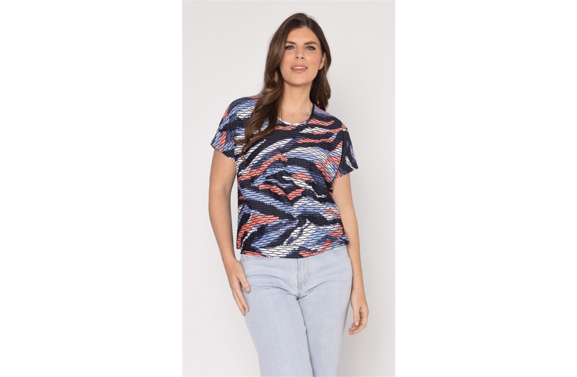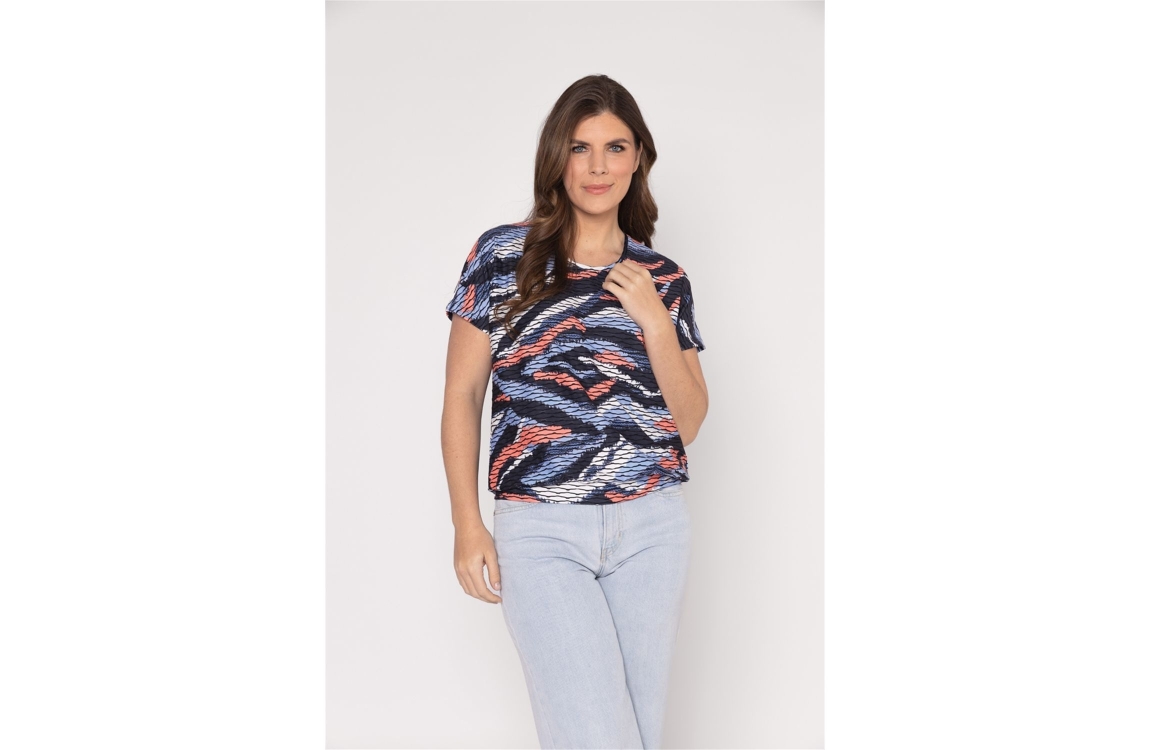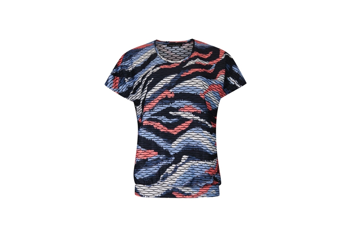 Roberto Sarto top 611122. Dit rechtvallende model heeft een ronde halslijn en korte mouwen. Deze blauwe top van Roberto Sarto is all-over bewerkt met een grafische print in verschillende kleuren en is uitgevoerd in stretchkwaliteit.
