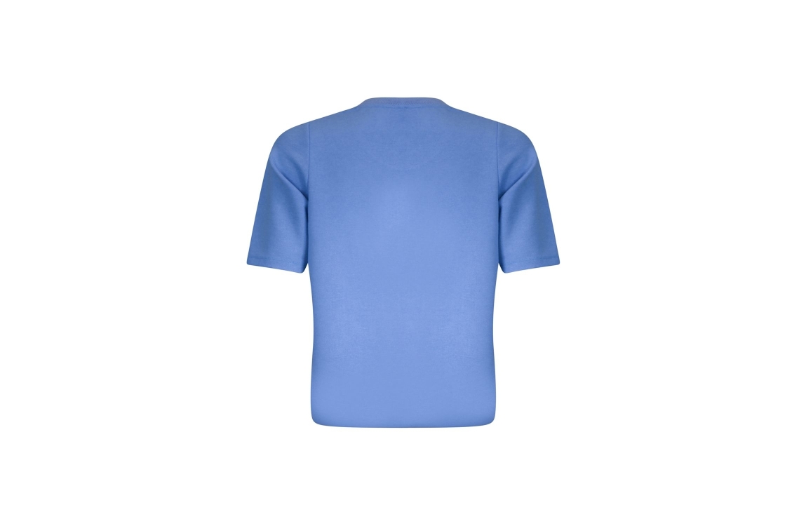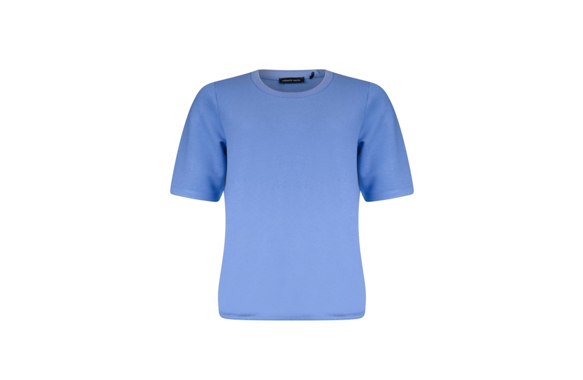 Roberto Sarto pullover 611117. Dit rechtvallende model is voorzien van een ronde hals afgewerkt met een motief en heeft korte mouwen. Deze blauwe pullover van Roberto Sarto is aan de onderzijde voorzien van een elastische boord.