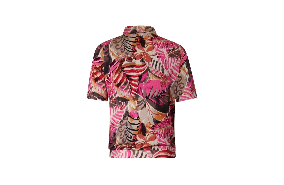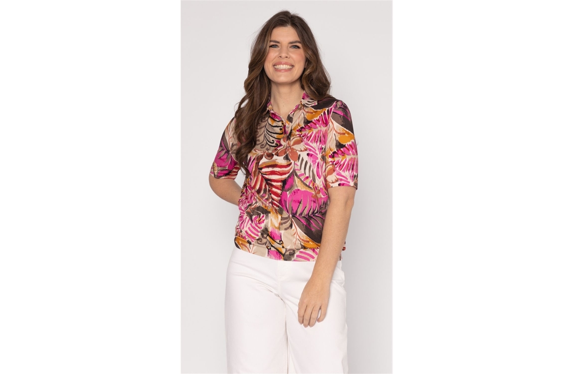 Roberto Sarto blouson 611129. Dit soepelvallende model is voorzien van een kraag en heeft korte mouwen. Deze multi colour blouson van Roberto Sarto sluit aan de voorzijde door middel van knopen. Dit model is bewerkt met een tropische print.