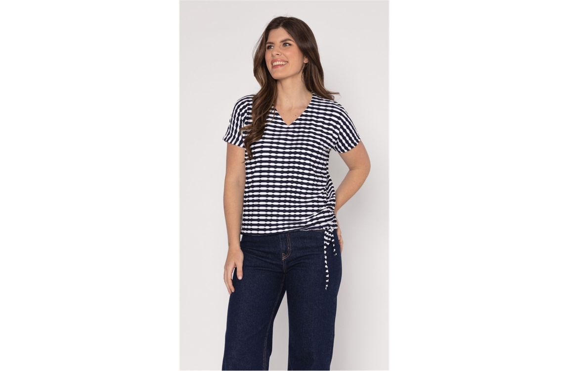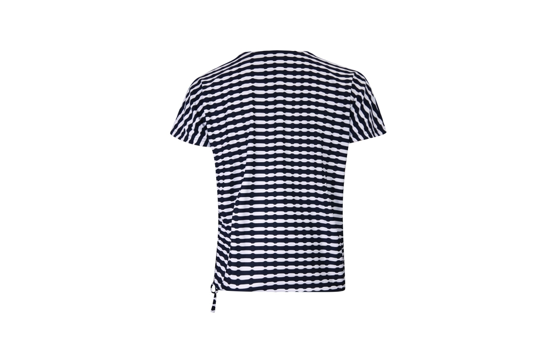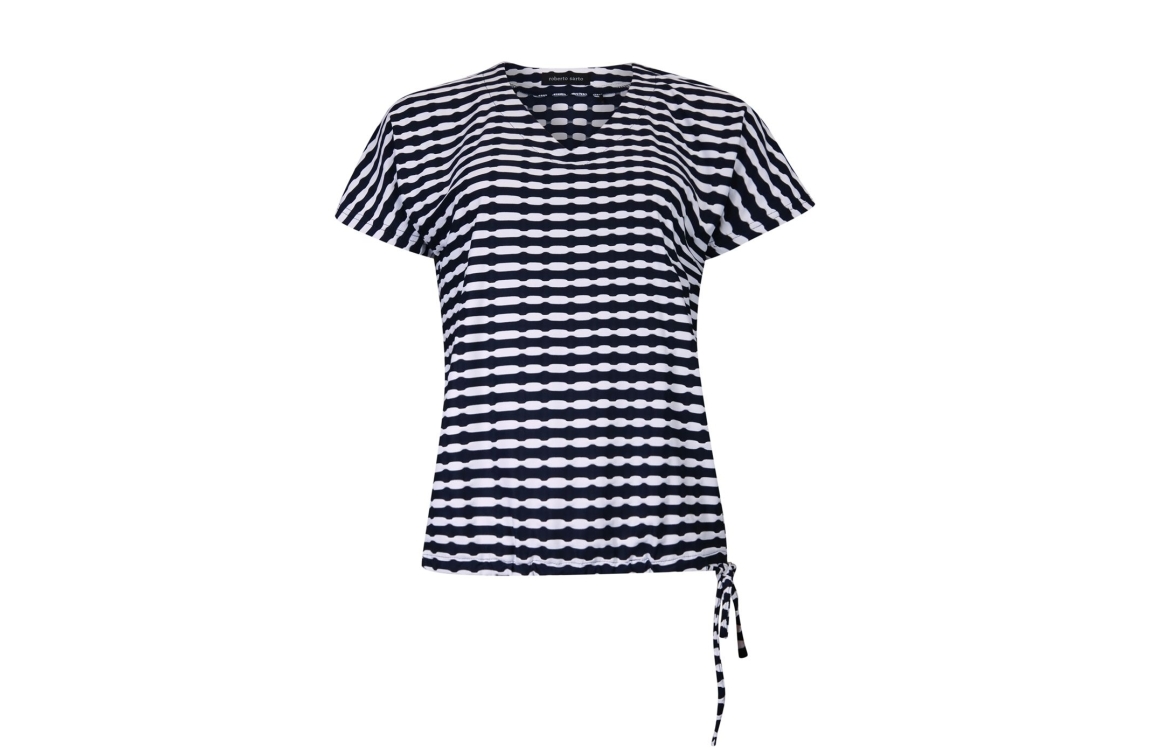 Roberto Sarto blouson 611157. Dit soepelvallende model is voorzien van een V-hals en heeft korte vleermuismouwen. Deze donkerblauw/witte blouson van Roberto Sarto is aan de onderzijde voorzien van een strikkoord. Dit model is bewerkt met een streepmotief.