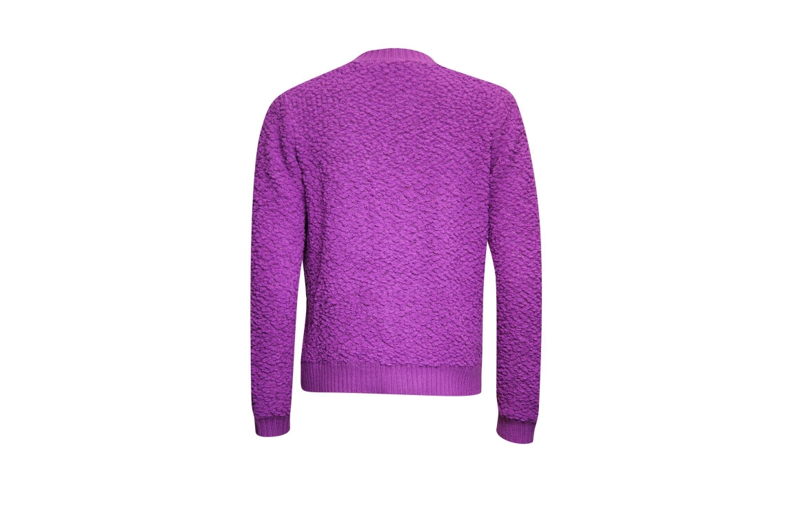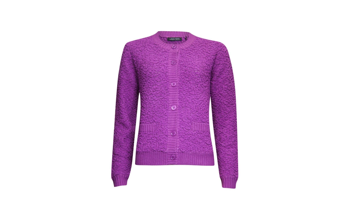 Roberto Sarto fashion cardingan o-neck. Dit rechtvallende model heeft een ronde hals en sluit met knoopjes aan de voorzijde. Deze paarse vest van Roberto Sarto heeft decoratieve zakjes en is in licht gewicht popcorn bouclé garen.