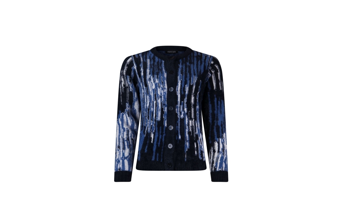 Roberto Sarto cardigan 531023. Dit rechtvallende model heeft een ronde hals en lange mouwen. Deze donkerblauwe cardigan van Roberto Sarto sluit aan de voorzijde door middel van knopen en is all-over bewerkt met een grafische print in verschillende kleuren.