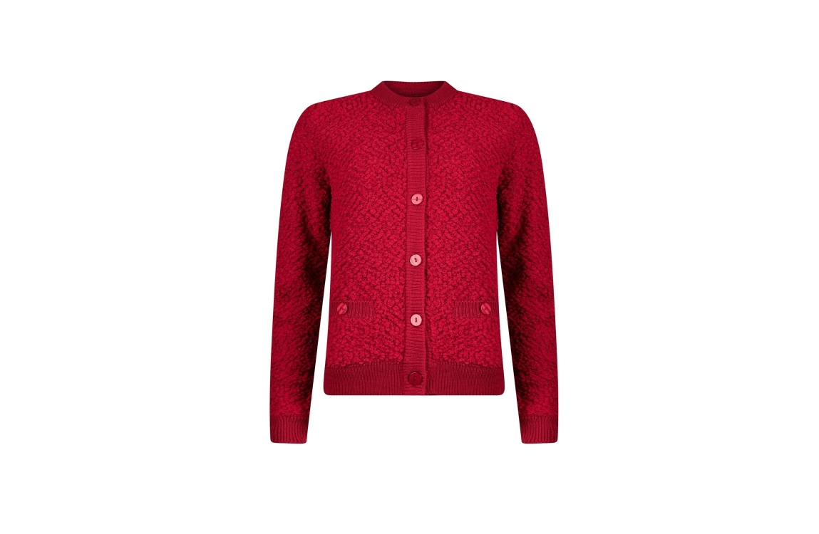 Roberto Sarto cardigan 531186. Dit rechtvallende model heeft een ronde hals en lange mouwen. Deze rode cardigan van Roberto Sarto sluit aan de voorzijde door middel van knopen en is uitgevoerd in een grove structuur met ribgebreide boorden. Het model is voorzien van twee knoopzakken.