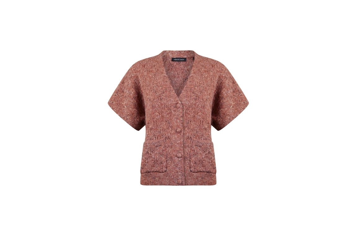 Roberto Sarto vest 531129. Dit wijdvallende model heeft een V-hals en korte, wijde mouwen. Deze mokkakleurige vest van Roberto Sarto sluit aan de voorzijde door middel van knopen en is voorzien van twee opgestikte zakken.