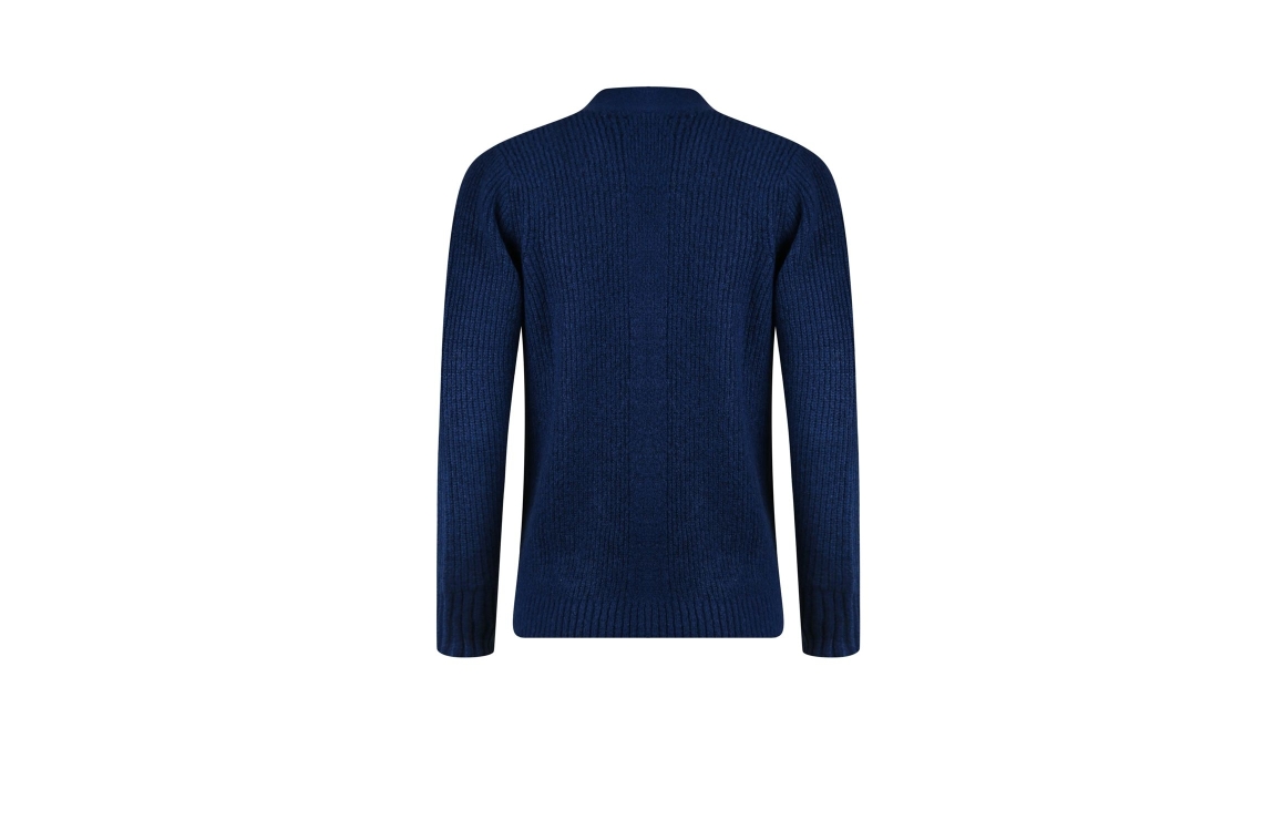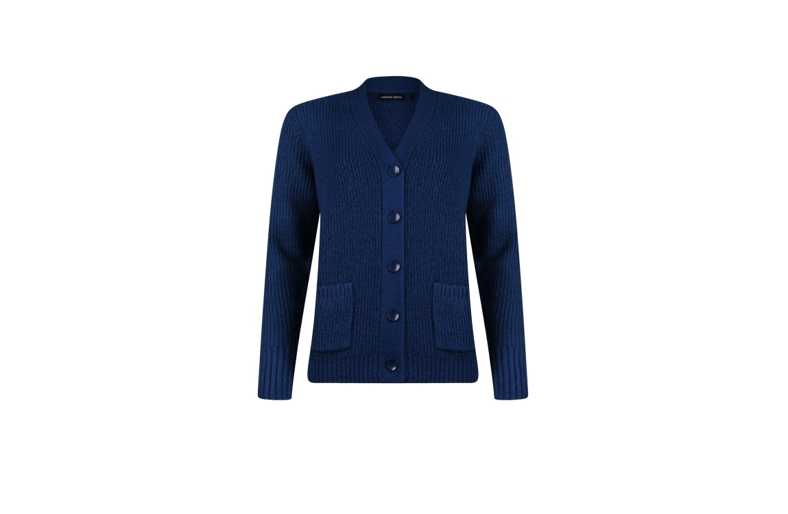 Roberto Sarto vest 531115. Dit rechtvallende model heeft een V-hals en lange mouwen. Deze donkerblauwe vest van Roberto Sarto sluit aan de voorzijde door middel van knopen en is uitgevoerd in ribgebreide kwaliteit. Het model is aan de voorzijde gedetailleerd met twee opgestikte zakken.