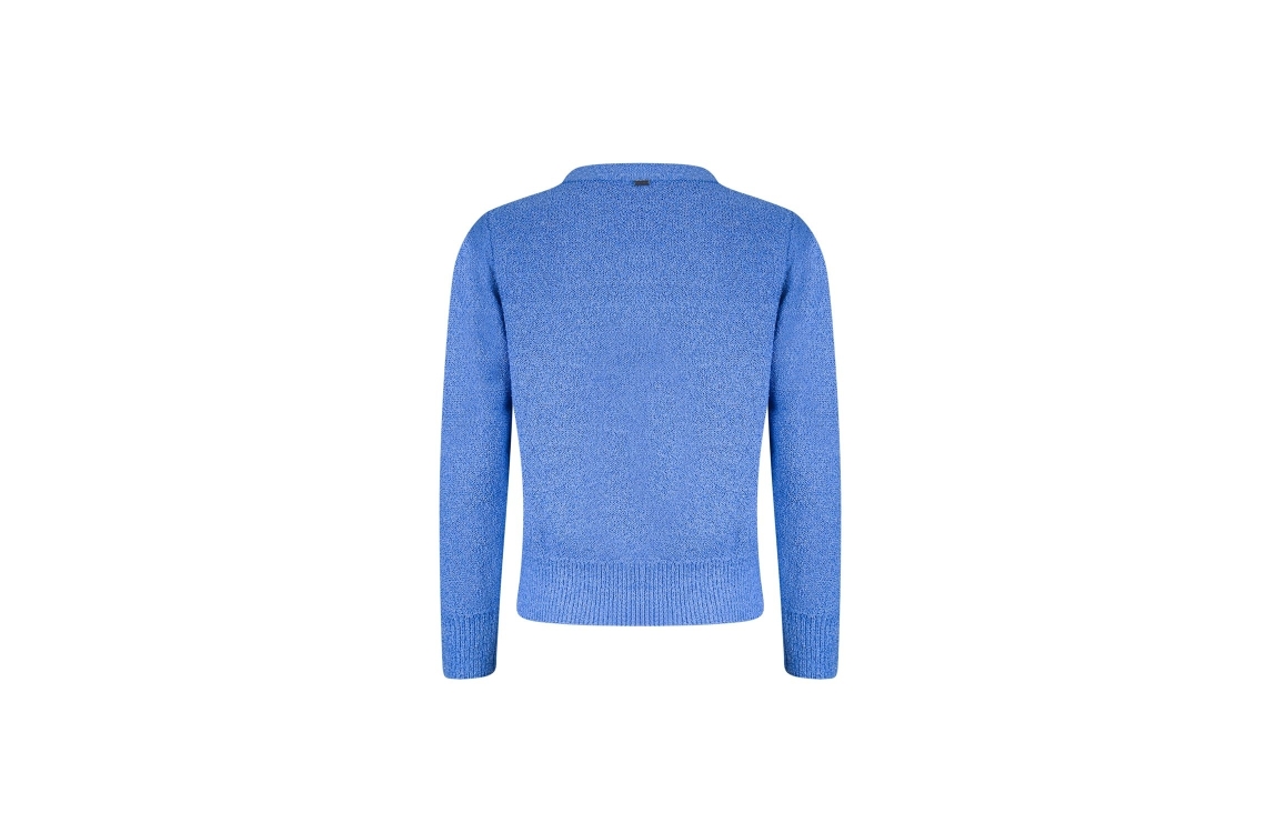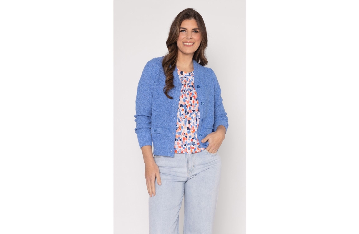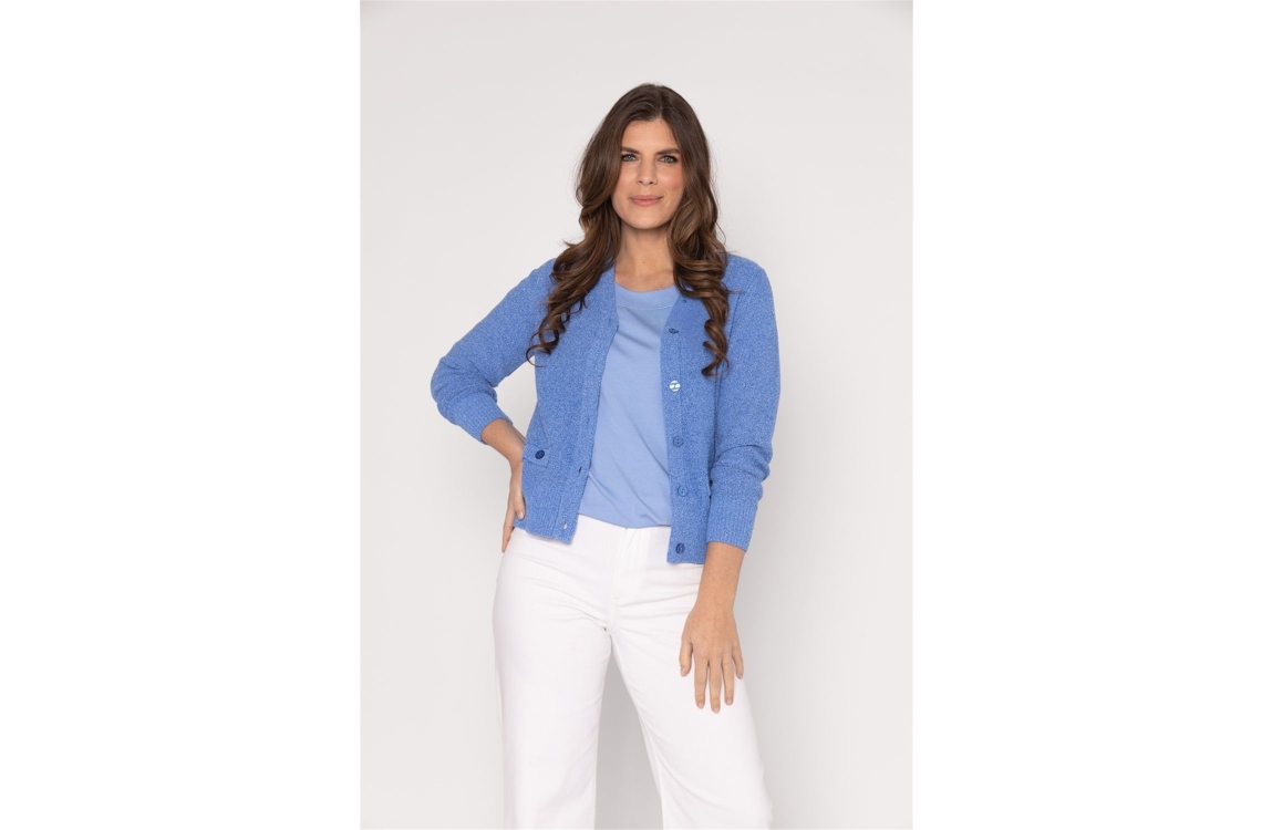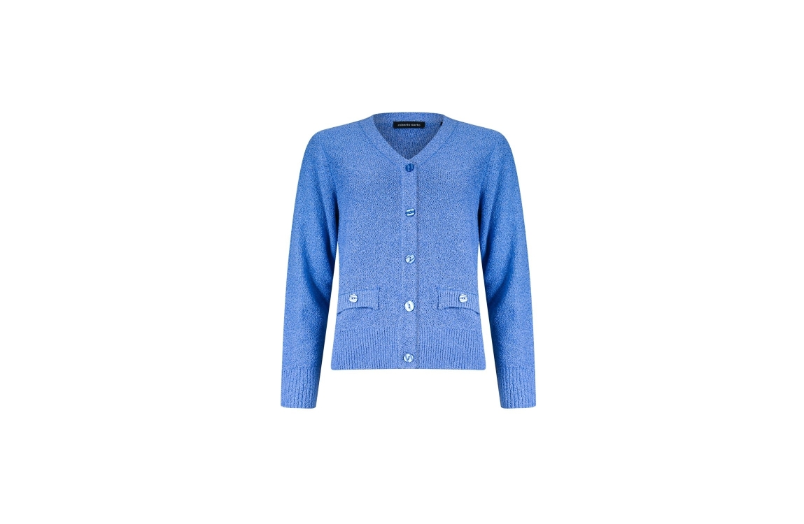 Roberto Sarto vest611139 730. Dit rechtvallende model heeft een V-hals en lange mouwen. Deze blauwe vest van Roberto Sarto sluit aan de voorzijde door middel van knopen en is voorzien van twee decoratieve zakken. Het model is all-over bewerkt met glitterdraden en is afgewerkt met ribgebreide boorden.