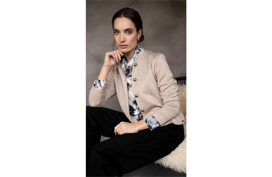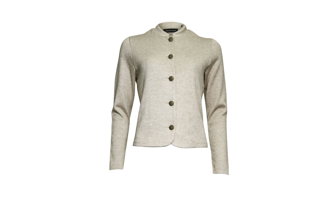 Roberto Sarto fashion jacket stand-up collar. Dit rechtvallend model heeft een kraag en lange mouwen. Deze beige vest van Roberto Sarto sluit door middel van knoopjes.
