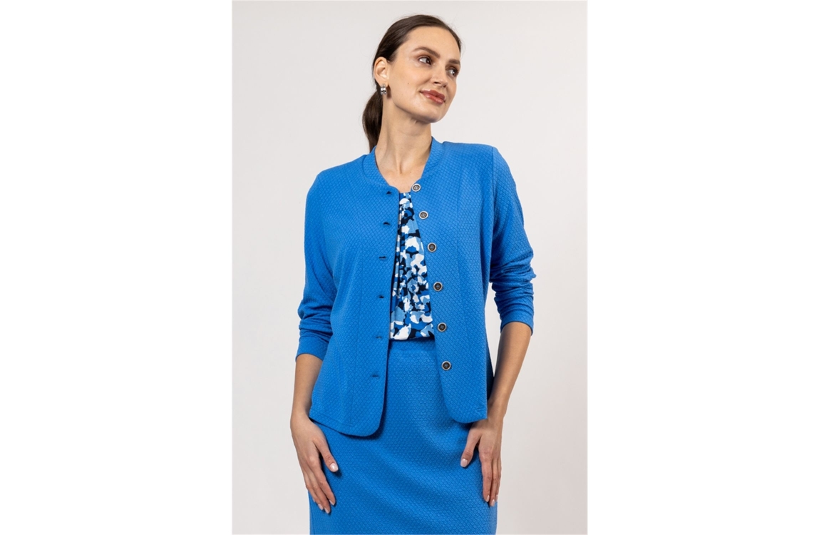 Roberto Sarto fashion jacket 511150. Dit rechtvallend model heeft een kraag en lange mouwen met schoudervulling. Deze blauwe gestructureerde jacket van Roberto Sarto sluit door middel van knoopjes.