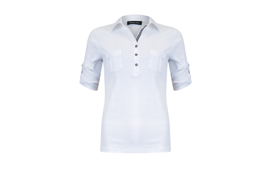 Sarto Fashion polo s/s 511167. Dit rechtvallende model is voorzien van een kraag met knopen en heeft korte mouwen met een lus en klein knoopje aan de mouw. Deze witte polo van Sarto Fashion is gemaakt van ribstof.