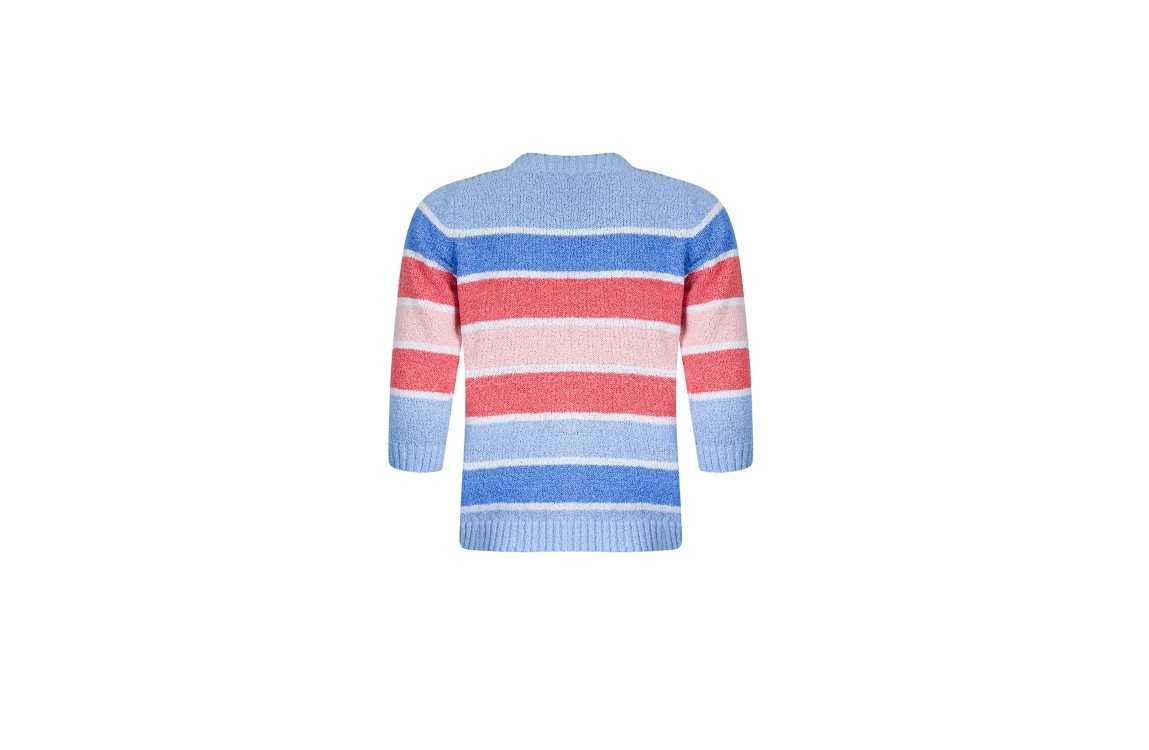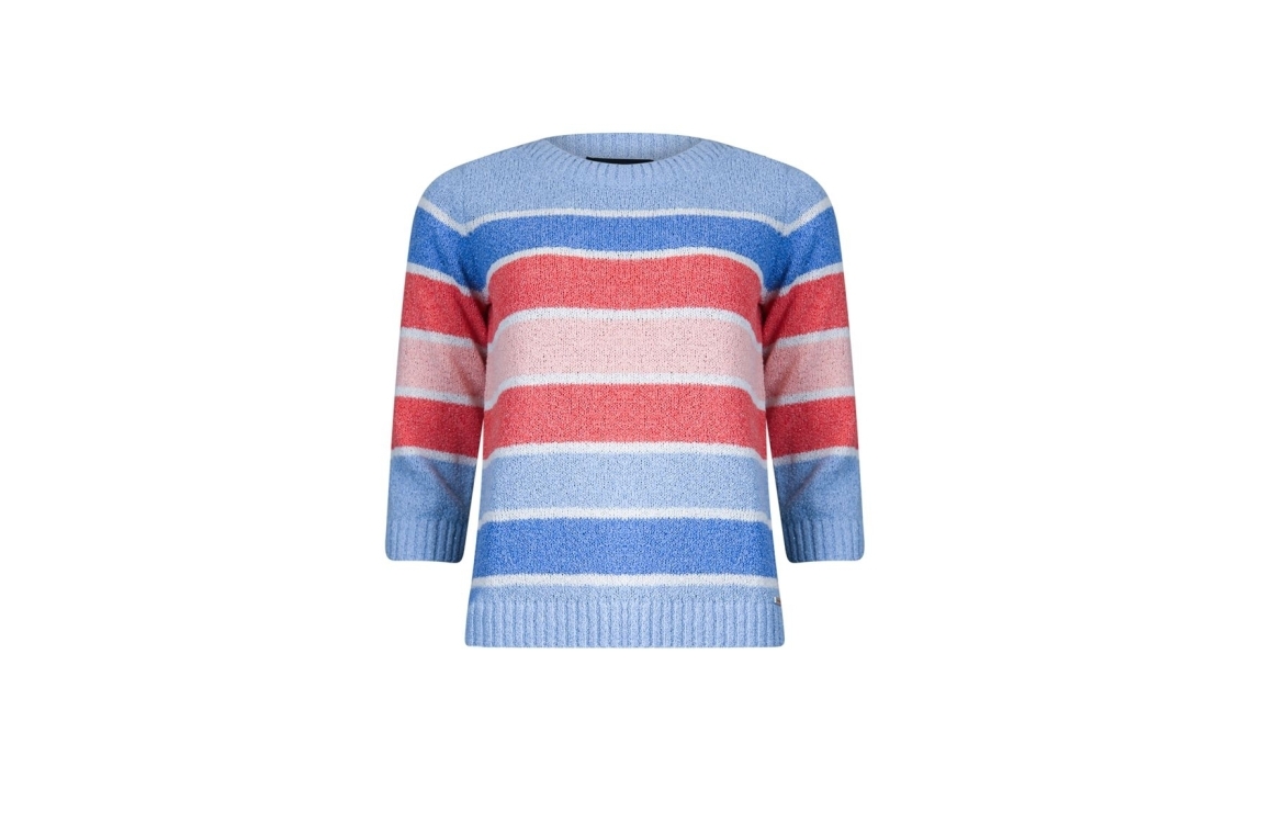 Roberto Sarto pullover 611138. Dit soepelvallende is voorzien van een ronde hals en heeft driekwart mouwen. Deze blauw/koraal kleurige pullover van Roberto Sarto is afgewerkt met ribgebreide boorden. Dit model is bewerkt met een streepmotief en afgewerkt met een glitterdraad.