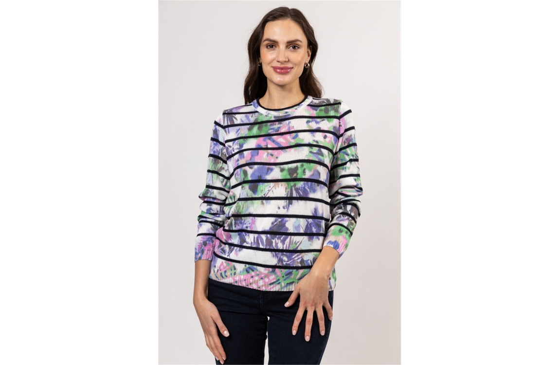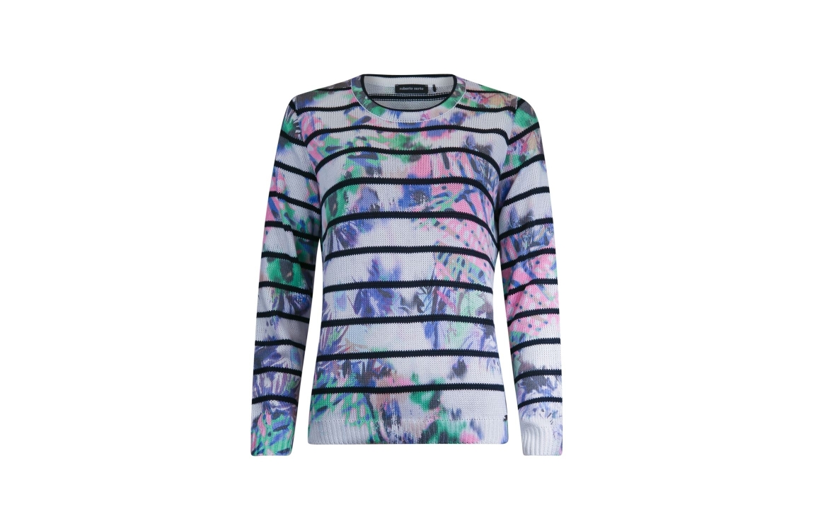 Sarto Fashion pullover 511135. Dit rechtvallend model is voorzien van een ronde hals en heeft lange mouwen. Deze gekleurde pullover van Roberto Sarto is afgewerkt met ribboorden. Dit model is bewerkt met strepen en een all-over print.