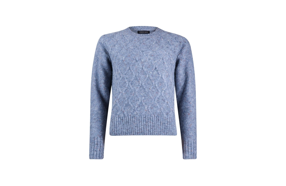Roberto Sarto pullover 531167. Dit rechtvallende model heeft een ronde halslijn en lange mouwen. Deze jeansblauwe pullover van Roberto Sarto is uitgevoerd in een kabelpatroon van verschillende kleurendraden en heeft afgewerkte ribgebreide boorden.